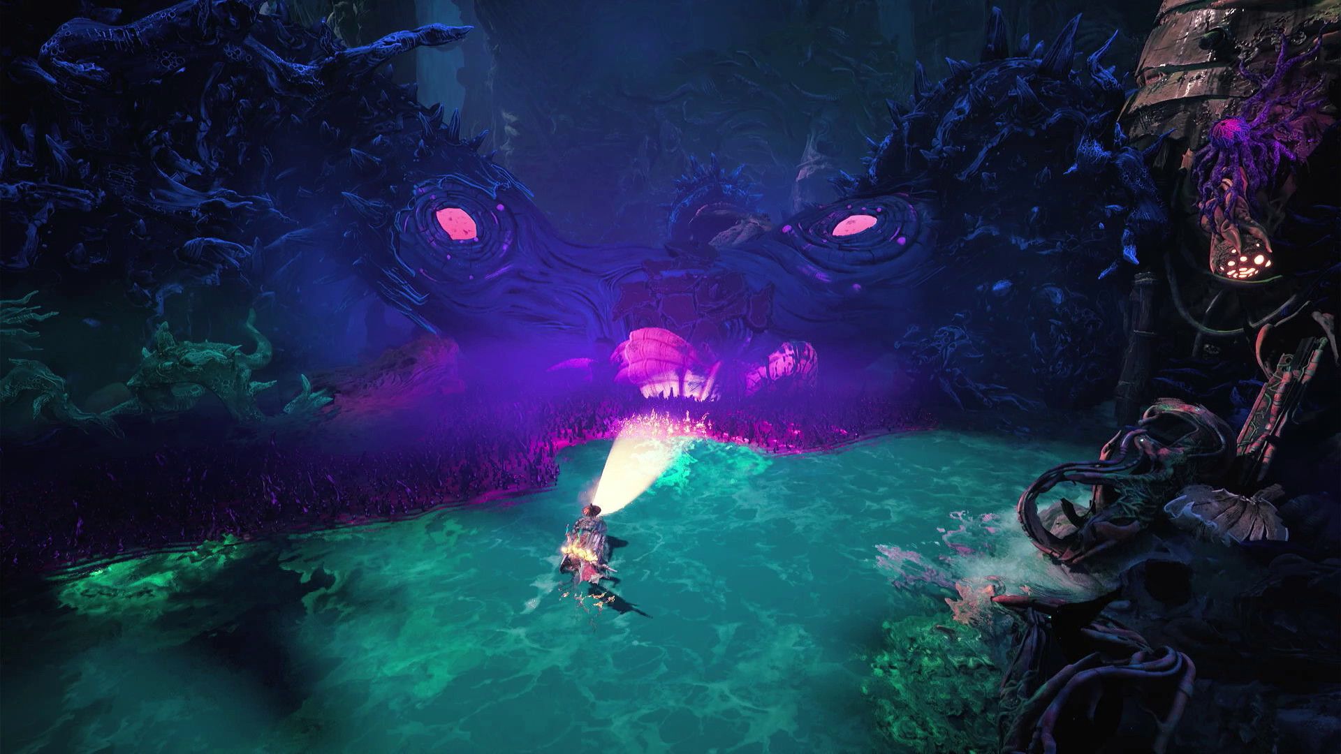 Once you have the boat back under control, head forward, using your light to navigate the murky, corrupted water. This will lead you to a creature trapped by the corruption. Shine your light on the corruption to cleanse it and free the creature. Once freed, the creature will clear the way forward, so follow it to continue.