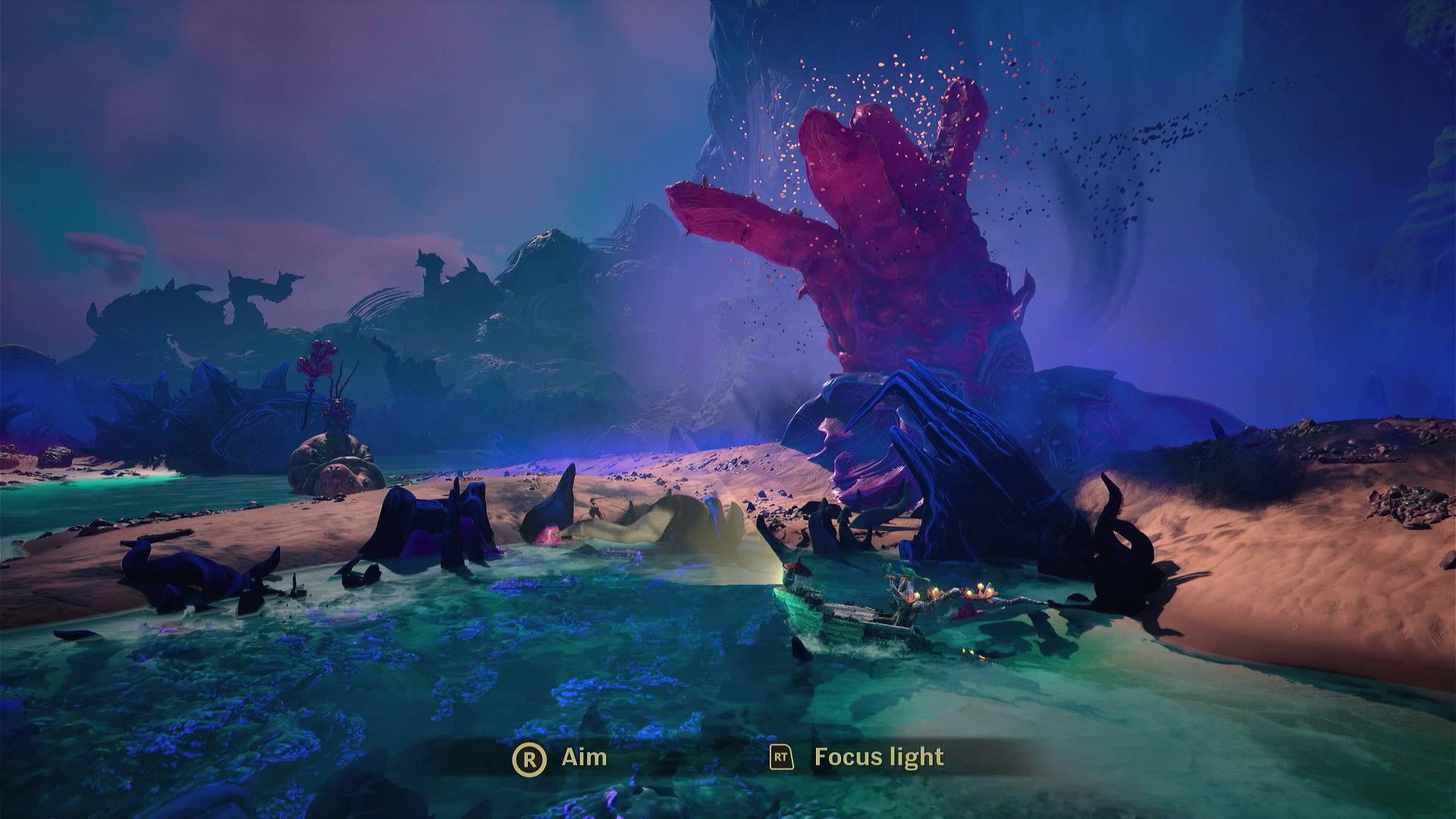 Next, shine your light on the big pink creature. This will start a cutscene and finish the boat portion of the game, *Keeper*.