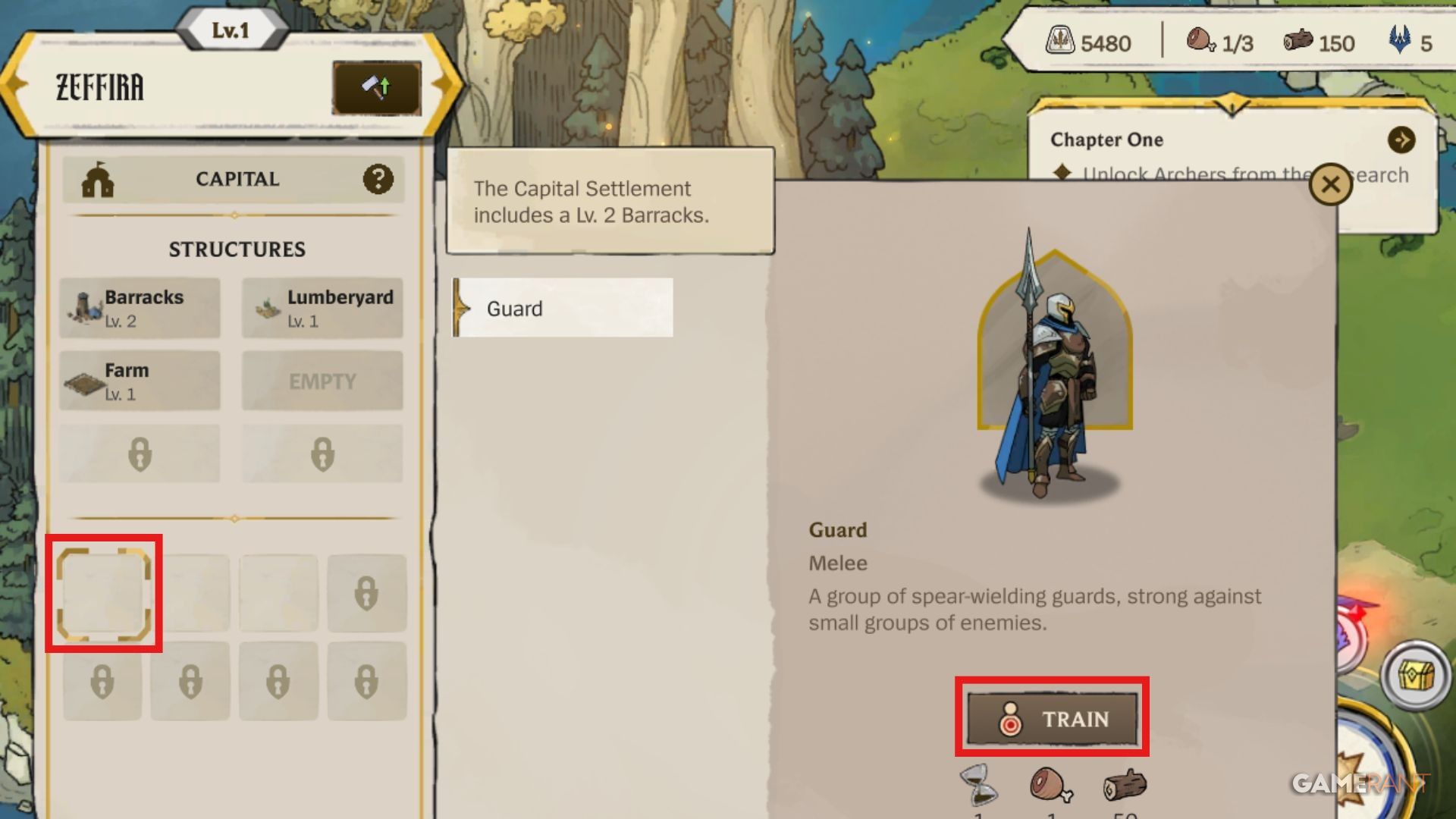 Once you’ve spent 10 Silver Shields to advance the turn, the farm will be completed. Since you already have a barracks in Zeffira, you can now start training units. Select one of the empty spaces at the bottom of your city screen to train Guards. Each Guard costs 1 Food and 50 Lumber, and training them will take another turn.