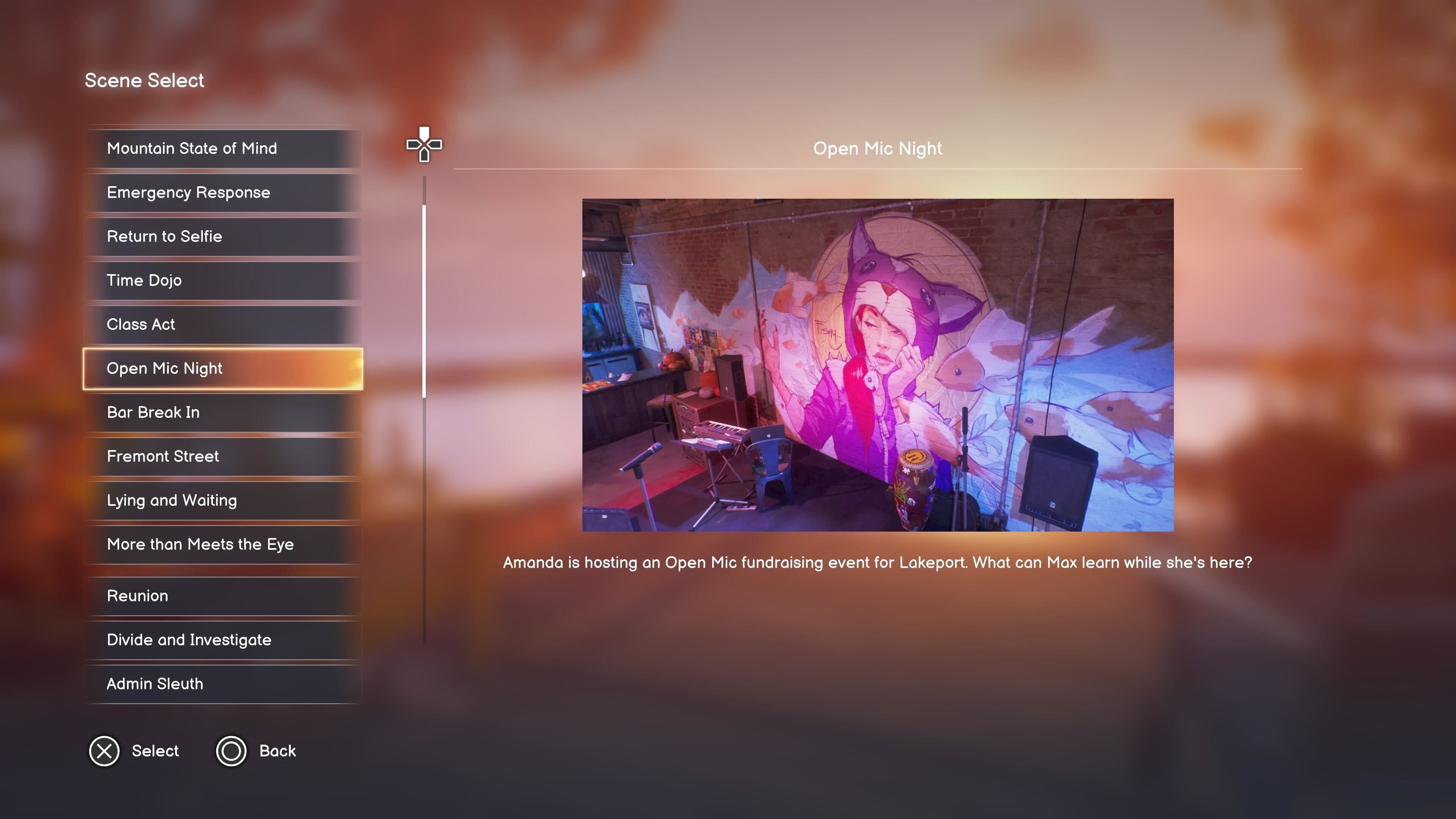 The “Scene Select” menu divides Life is Strange: Reunion into three separate acts, with clearly defined sections for each.