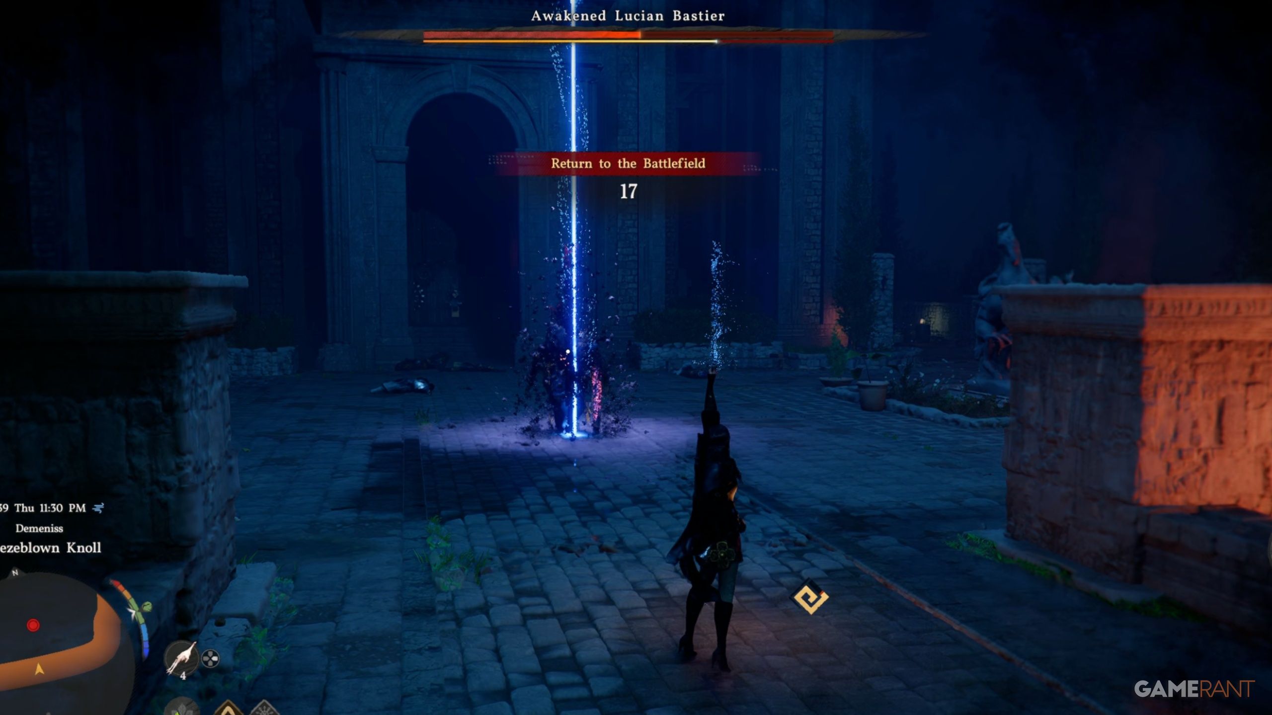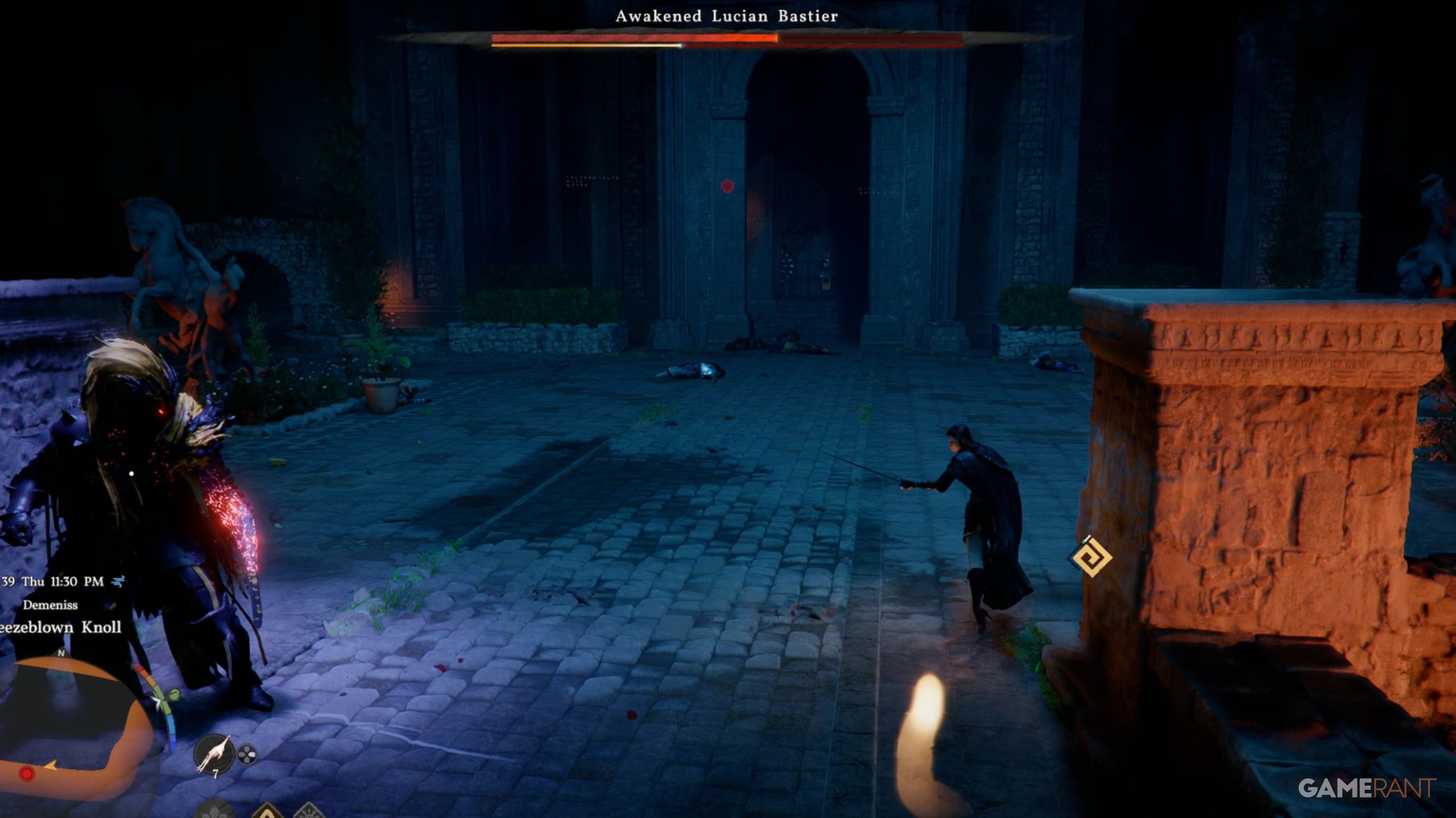 There’s a helpful strategy involving cheese against Lucian Bastier. When you’re facing the castle, jump onto the pillar on the left. Then, repeatedly use the Shield Throw (press R3) to prevent Lucian from attacking. During the second phase of the fight, you can either jump out of the arena or go down the stairs – he usually won’t follow you down there.