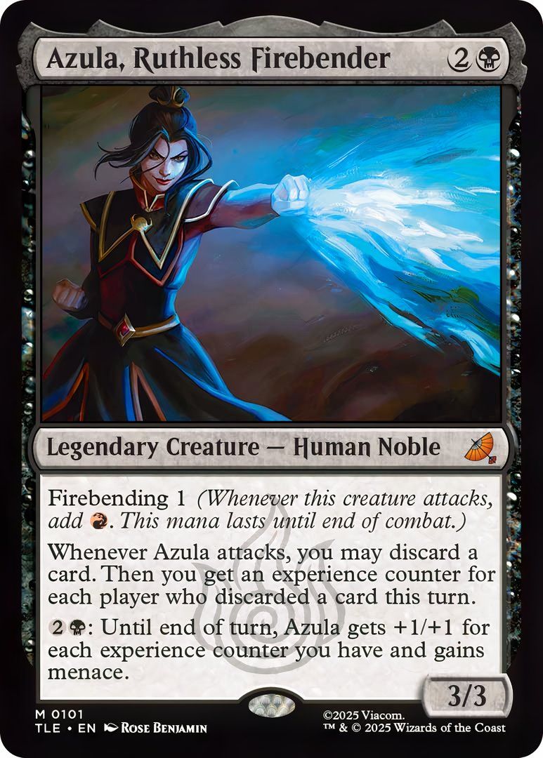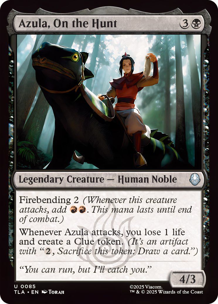 The new Avatar set features several cards focused on Azula and her storyline. It begins with “Azula, On the Hunt,” a black card that represents her firebending abilities and introduces clue tokens – a new element in the set used by villains to track down Aang and his team. Her arc continues with “Azula, Cunning Usurper” (blue/black) and “Fire Lord Azula” (red/blue/black). Additionally, a lesson card dedicated to Azula returns from the MTG Strixhaven set, but without the “Learn” ability.