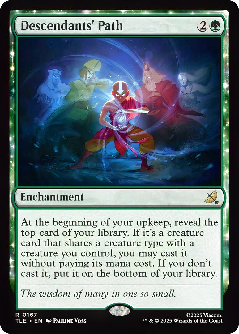 A cool aspect of the Avatar set in Magic: The Gathering is how the characters’ card designs show their development throughout the original TV series. Characters like Aang, Katara, and Sokka start with cards using only one or two colors of mana, but their power grows, reflected by cards that use increasingly more colors. Aang is a great example: he begins as a single-color white card (“Aang the Last Airbender”), becomes a three-color card (“Aang at the Crossroads”), and ultimately becomes a powerful, five-color creature with the card “Avatar Aang/Aang, Master of Elements.”