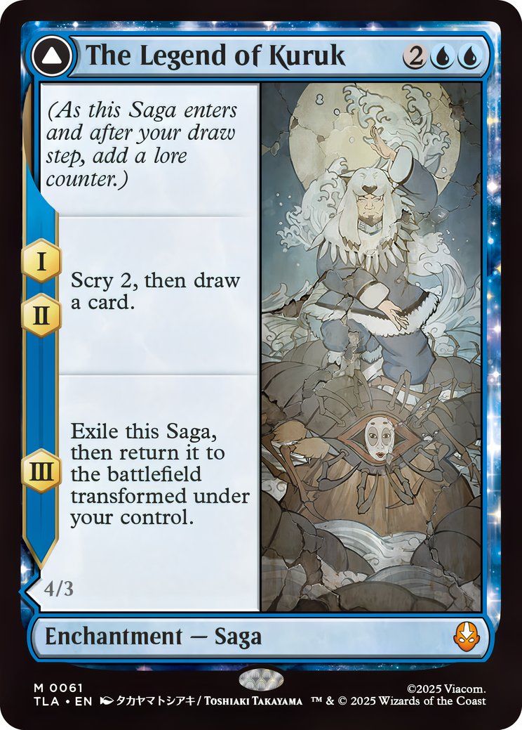 We’re bringing back sagas – a way to tell multi-part stories and share legends of characters from the past, like The Legend of Kuruk/Avatar Kuruk. This feature was previously seen in the Kamigawa: Neon Dynasty set.