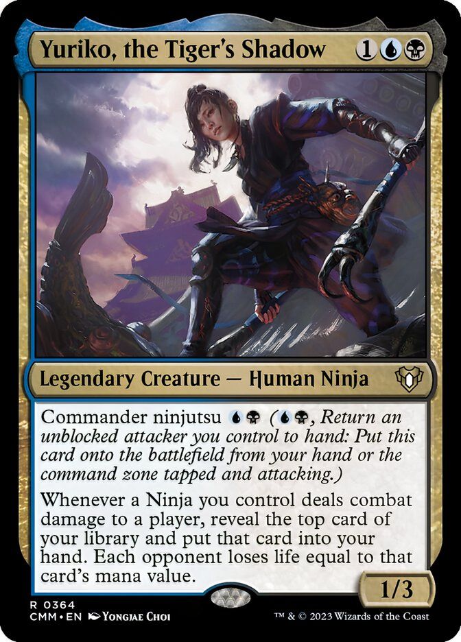 Fans familiar with Magic: The Gathering Commander decks likely already know how strong Yuriko, the Tiger’s Shadow is – she’s consistently one of the game’s most played commanders. Yuriko is a Blue and Black creature with a unique ability: you can always cast her from your command zone for just one blue and one black mana, ignoring any extra costs that usually apply to repeatedly casting commanders.