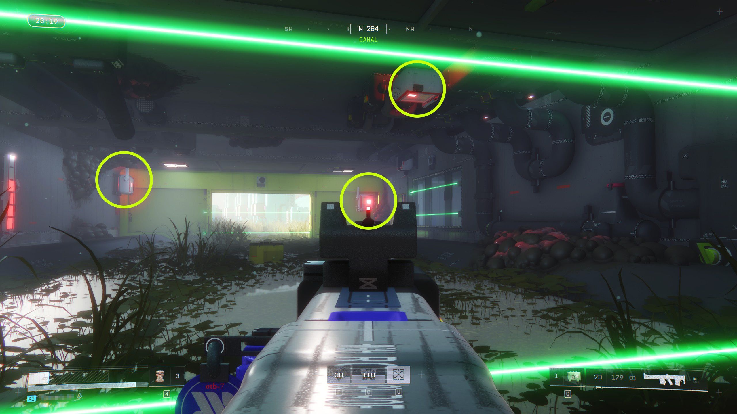 Go to Dire Marsh and find the Canal area, which is east of Maintenance and south of the Algae Ponds. You’ll see the Canal leading to a yellow tunnel guarded by green security lasers. Get close to the lasers, but stop before you walk into them.