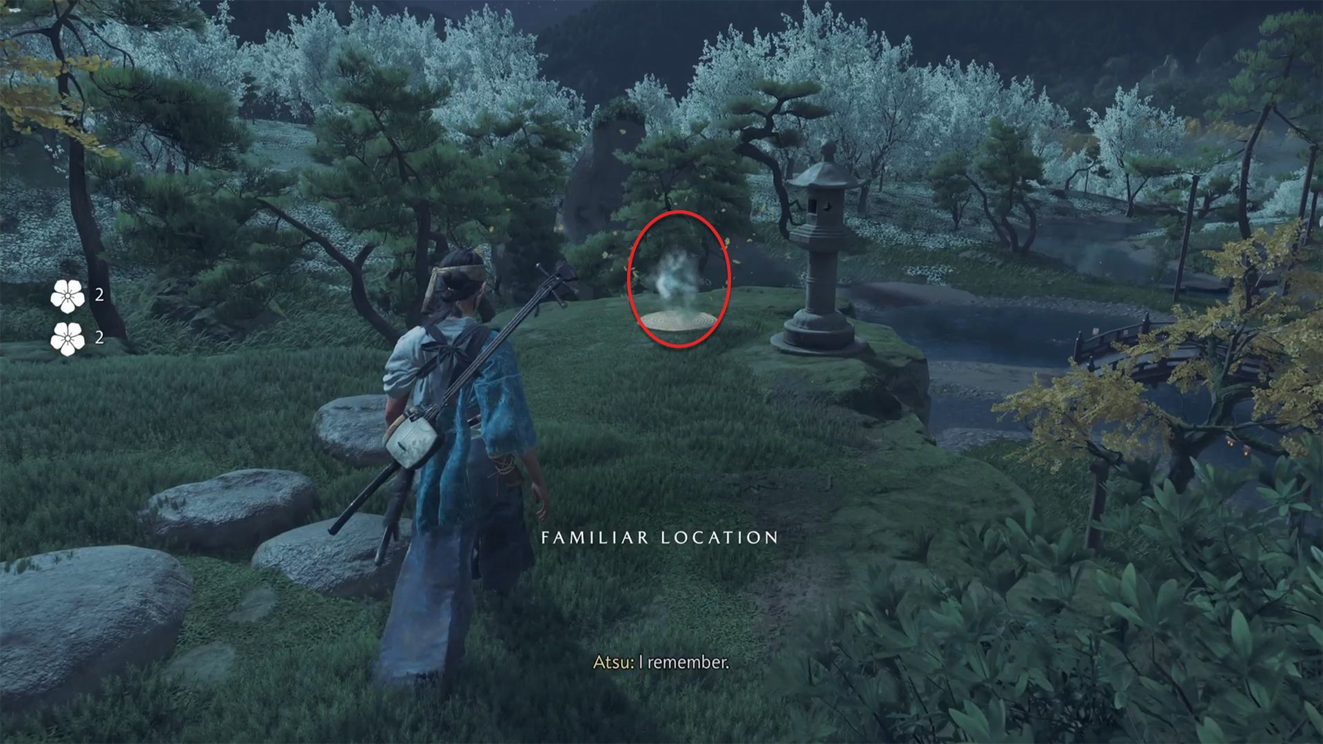 Your first memory is found close to the house, on the cliff above the bridge below. Go to that location and switch to Atsu’s past. Then, follow her mother’s instructions to finish the memory.