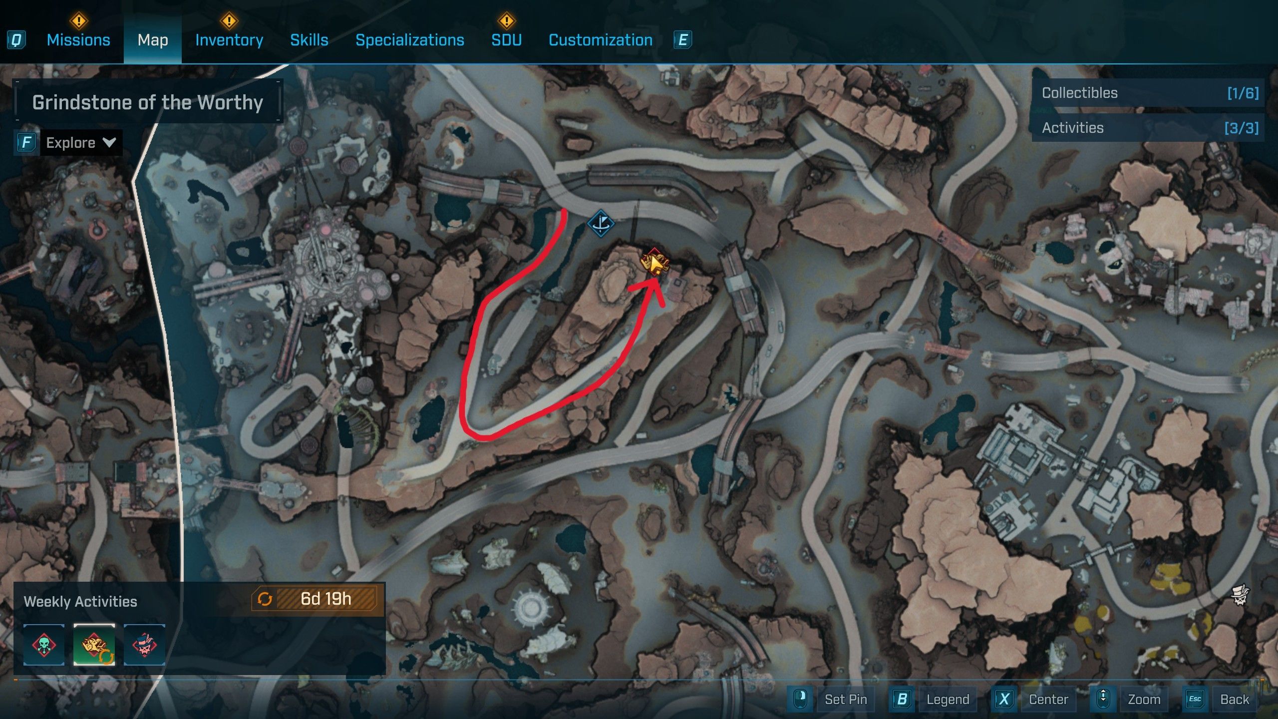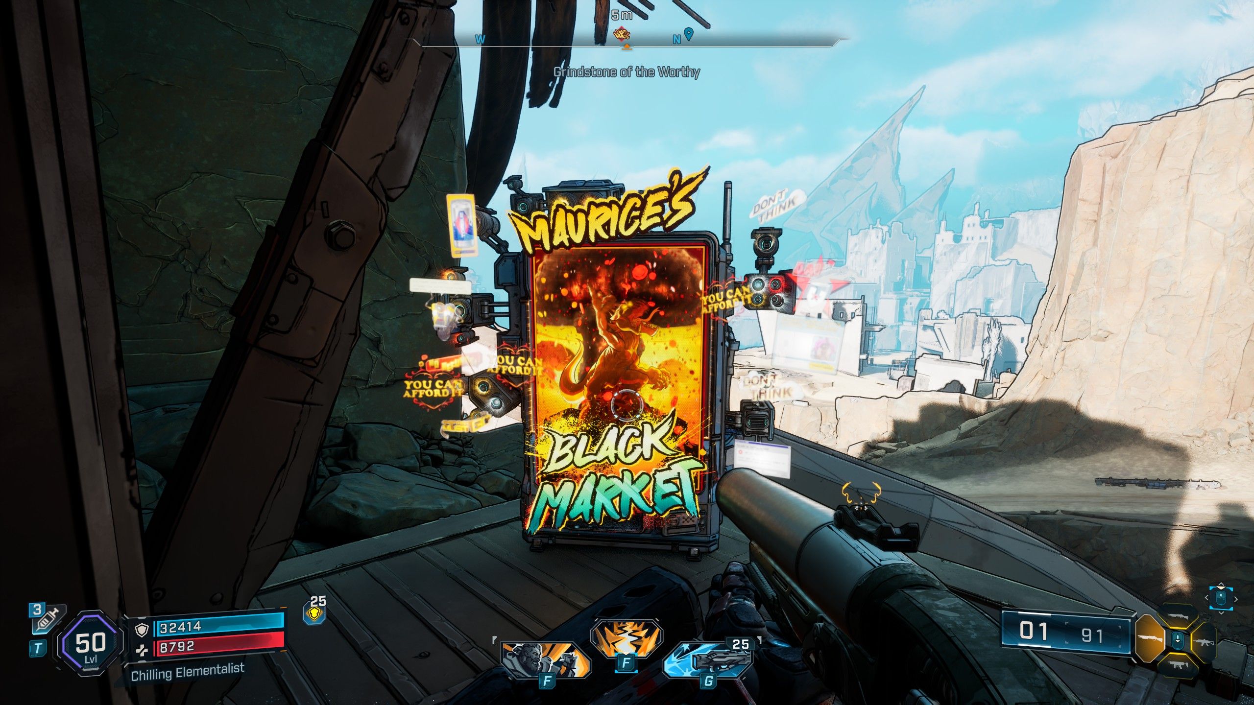 You can find Maurice’s Black Market this week in Grindstone of the Worthy, located in Carcadia Burn. Check the map below for the exact spot – you’ll need to set a marker and climb the cliff to reach the Vending Machine. The easiest ways to get there are by using the Rustic Hurl Order Silo or by heading south of the Crumblehall landmark. Remember, Maurice’s Vending Machine is invisible until you get close, so be sure to stand on the ledge to make it appear.