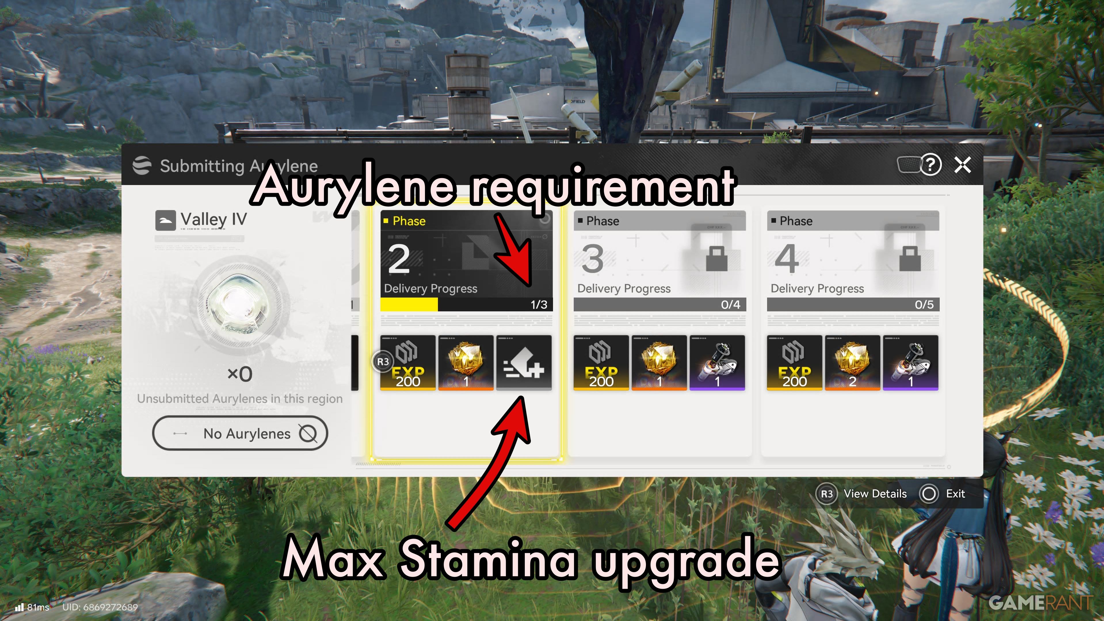 After getting your first Aurylene, go to any teleportation point (TP Point). When you get close, a menu will pop up. Select the “Submit Aurylene” option at the bottom of the menu. This will show you the different reward phases, and how much Aurylene you need to turn in for each one.