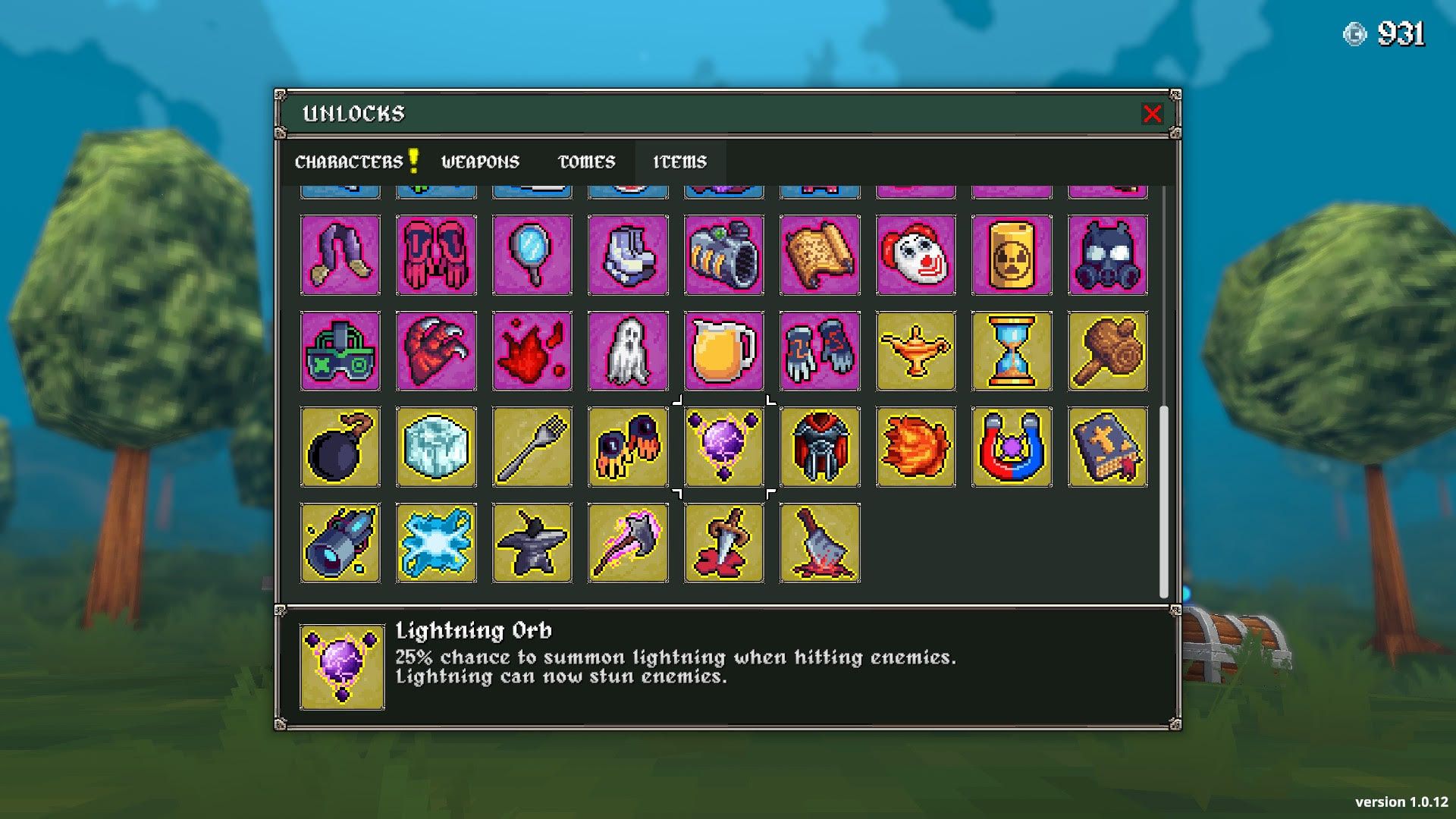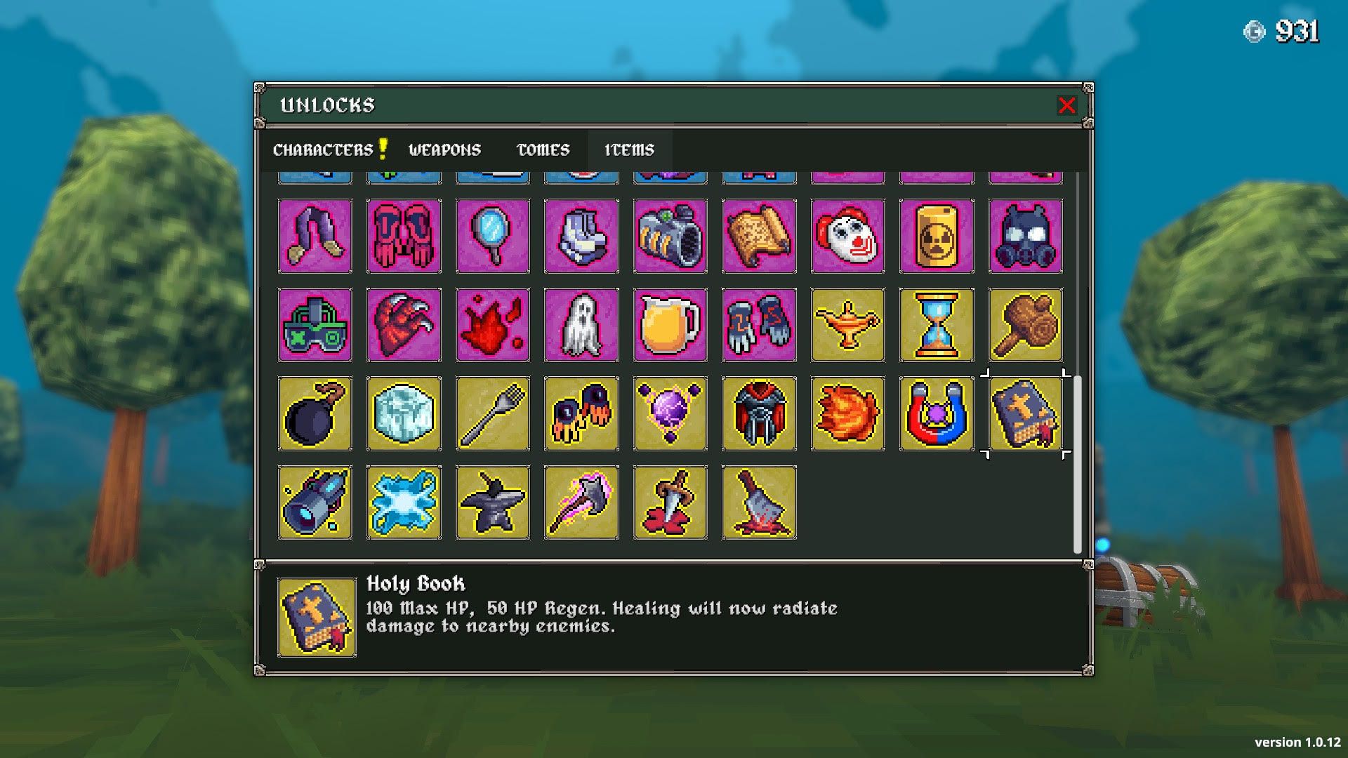 | Holy Book | Boosts HP and regeneration. Healing also deals damage to nearby enemies. |