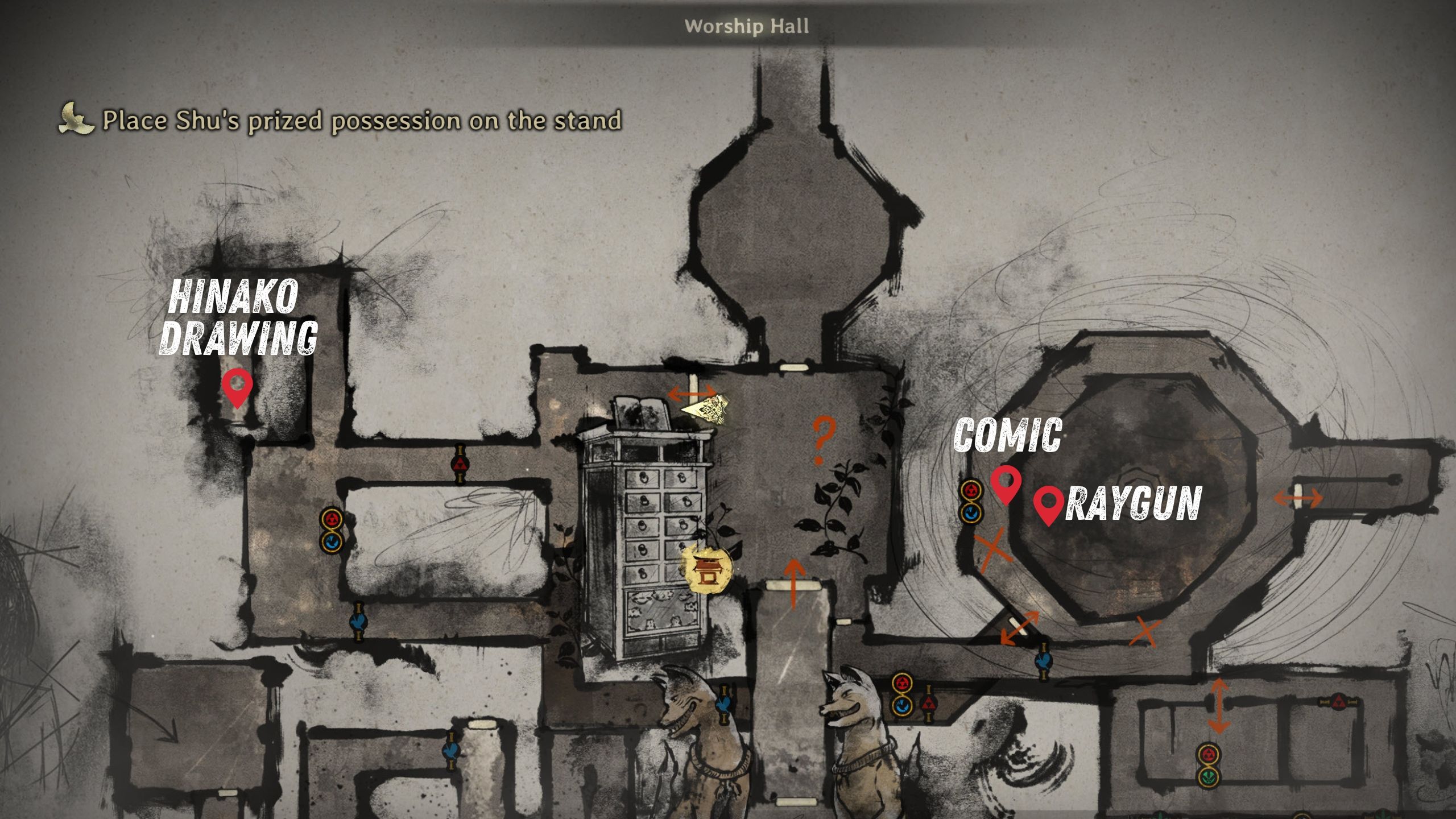 Depending on the puzzle difficulty – Story, Hard, or Lost in the Fog – you’ll need to find one, two, or three of Shu’s special items. You can see exactly where to find these items marked on the map. To begin, grab the note located near the large double doors.