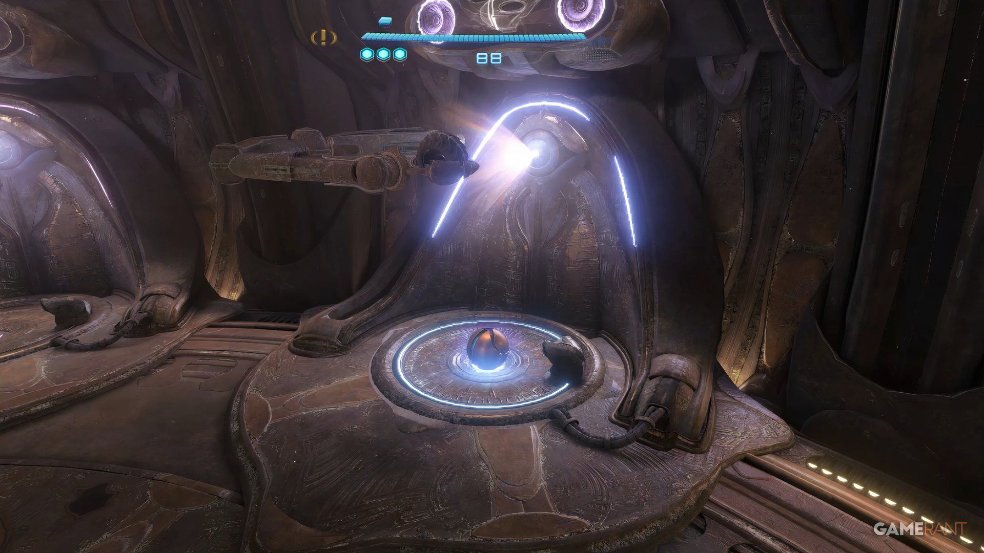 - Go into Morph Ball mode, roll onto the tire’s spot, and wait for the arm to grab Samus, lifting her to the floor above.