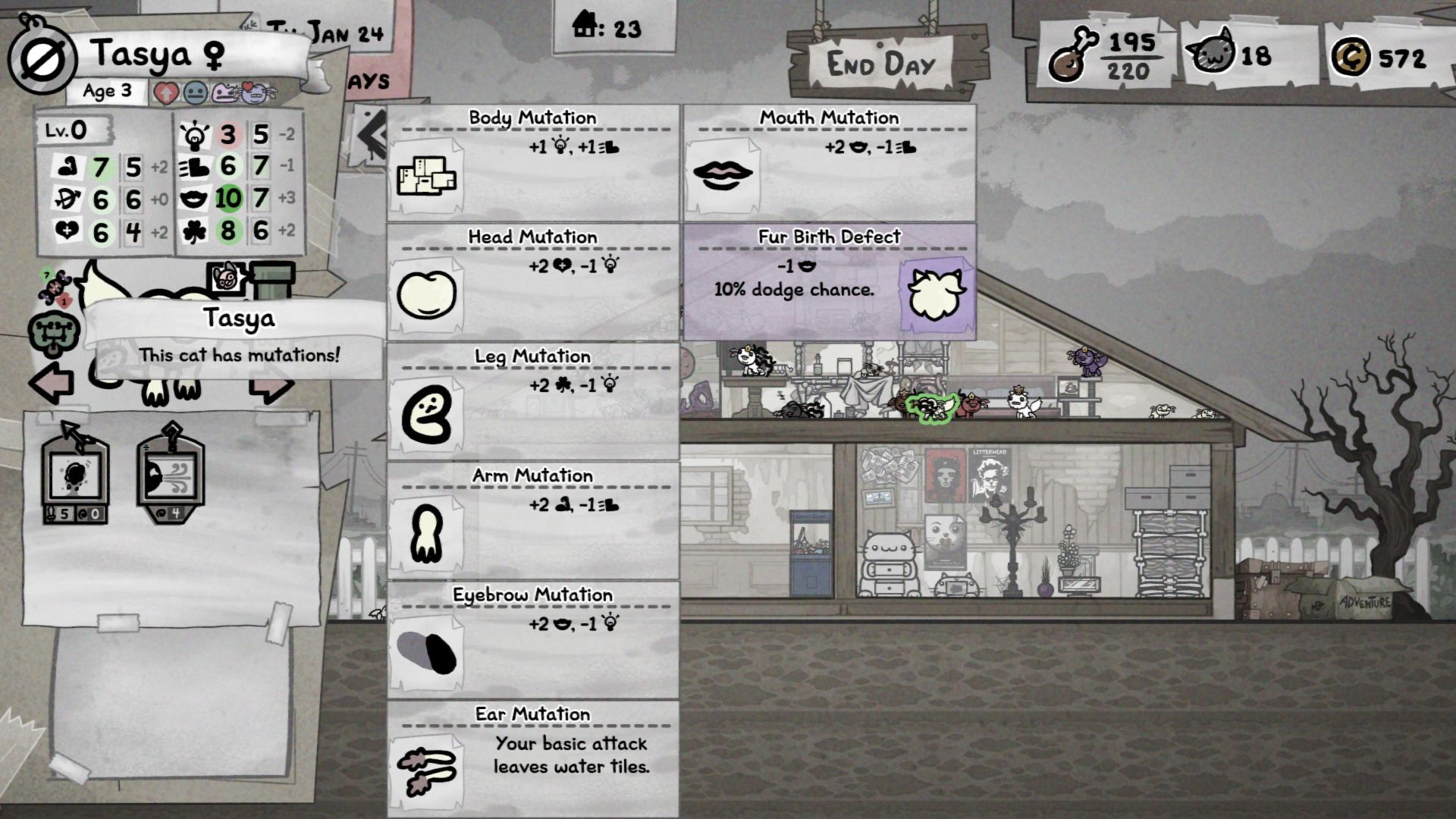 Throughout the night, your cats sometimes evolve, gaining unique mutations that improve their strength and skills. You can pass these traits—along with their basic stats—down to future generations, letting you breed incredibly powerful cats! Just avoid breeding cats that are too closely related, or they might develop harmful mutations.