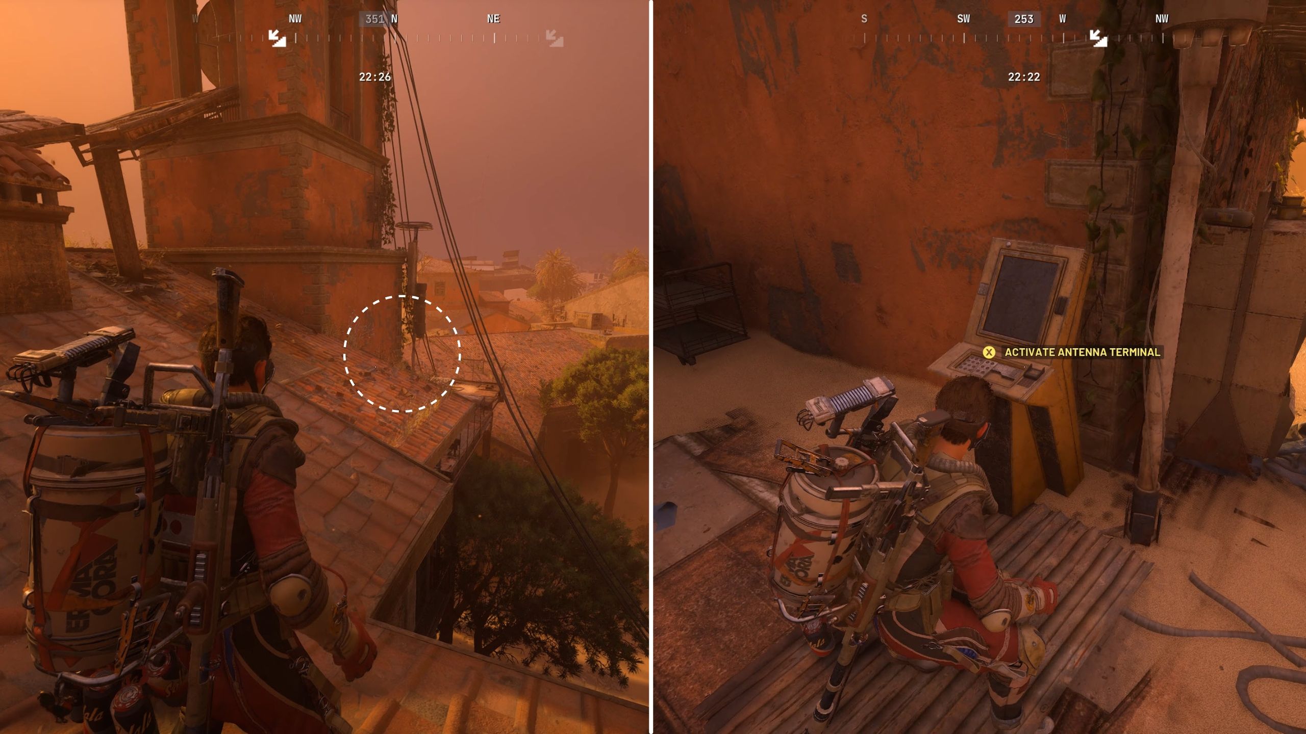 To activate the antenna on top of the tower, players first need to find the battery cell and place it into the generator on the left. Then, turn the generator on using the switch located on its right side – do this before climbing the tower!