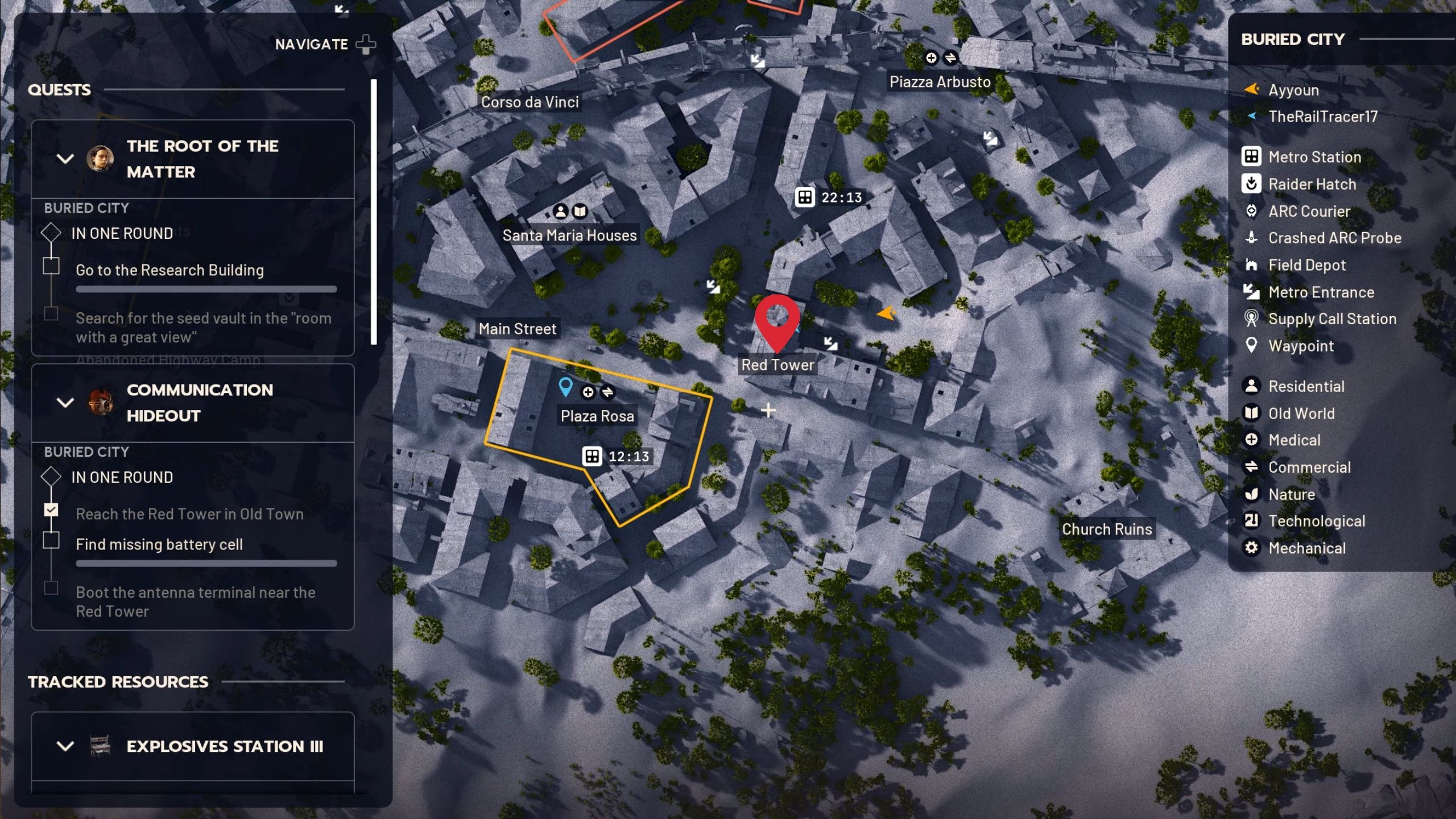 To begin the Communication Hideout quest in ARC Raiders, go to the Red Tower landmark on the Buried City map. It’s located just northeast of Plaza Rosa, and you’ll need to zoom in slightly on the map to find it.