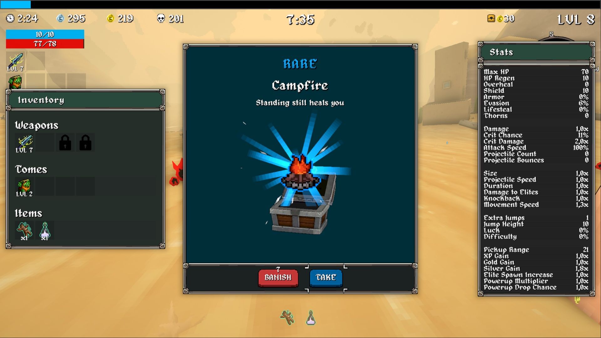 Don’t ignore the Campfire just because it doesn’t directly increase your damage. It’s really valuable for staying alive. Just be careful – enemies like the Cactus and mini/stage bosses can attack from a distance, so don’t stand still for too long!
