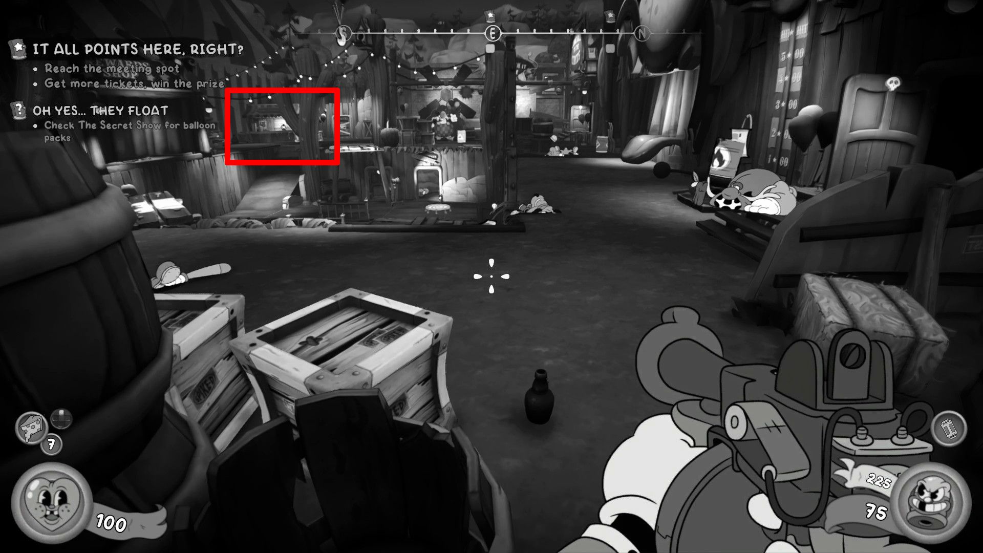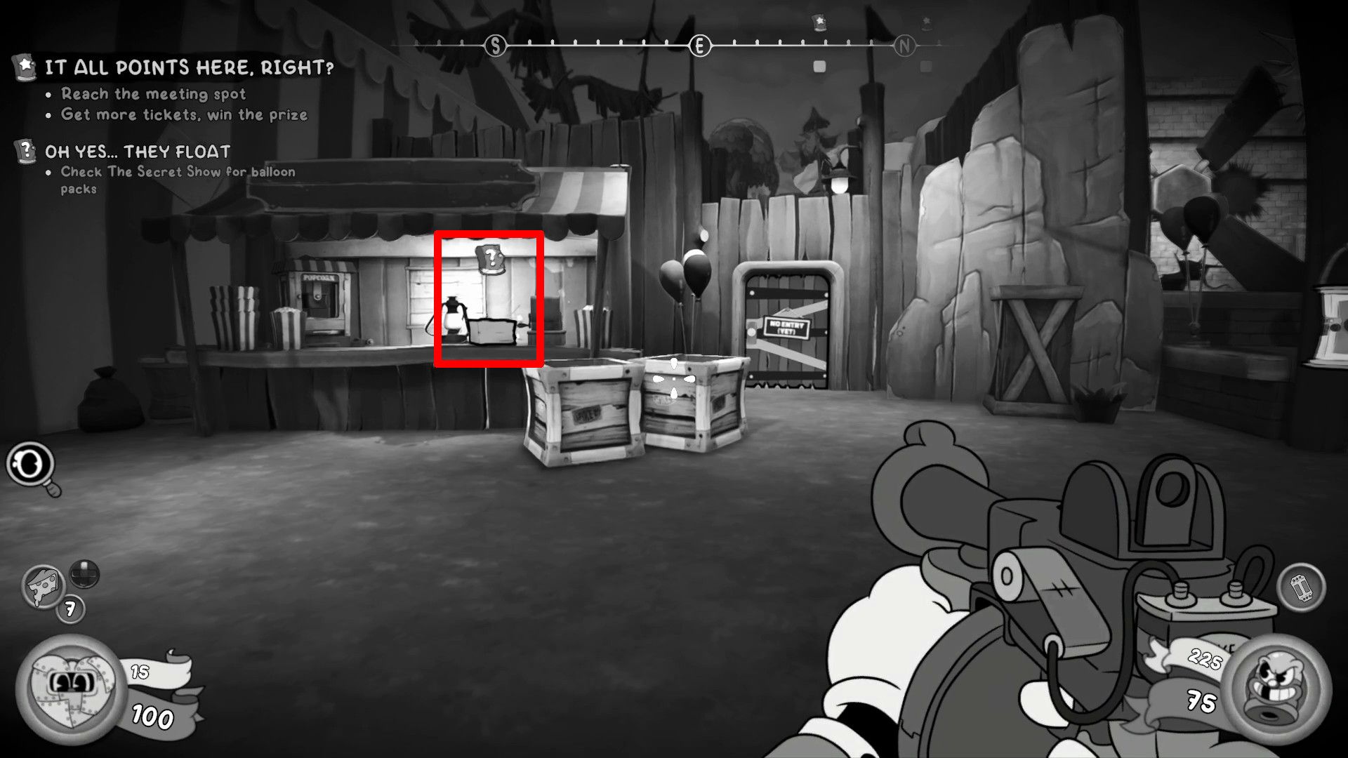 You can find the balloon pack about three-quarters of the way through the “It All Points Here, Right?” section, inside the High Noon Theme Park. This area is accessed through the door that requires four tickets. Once you’ve dealt with the enemies there, head to the southeast corner. You’ll find a box next to a lantern in one of the stalls – that’s where you can buy the Pack of Deflated Balloons for 25 coins.