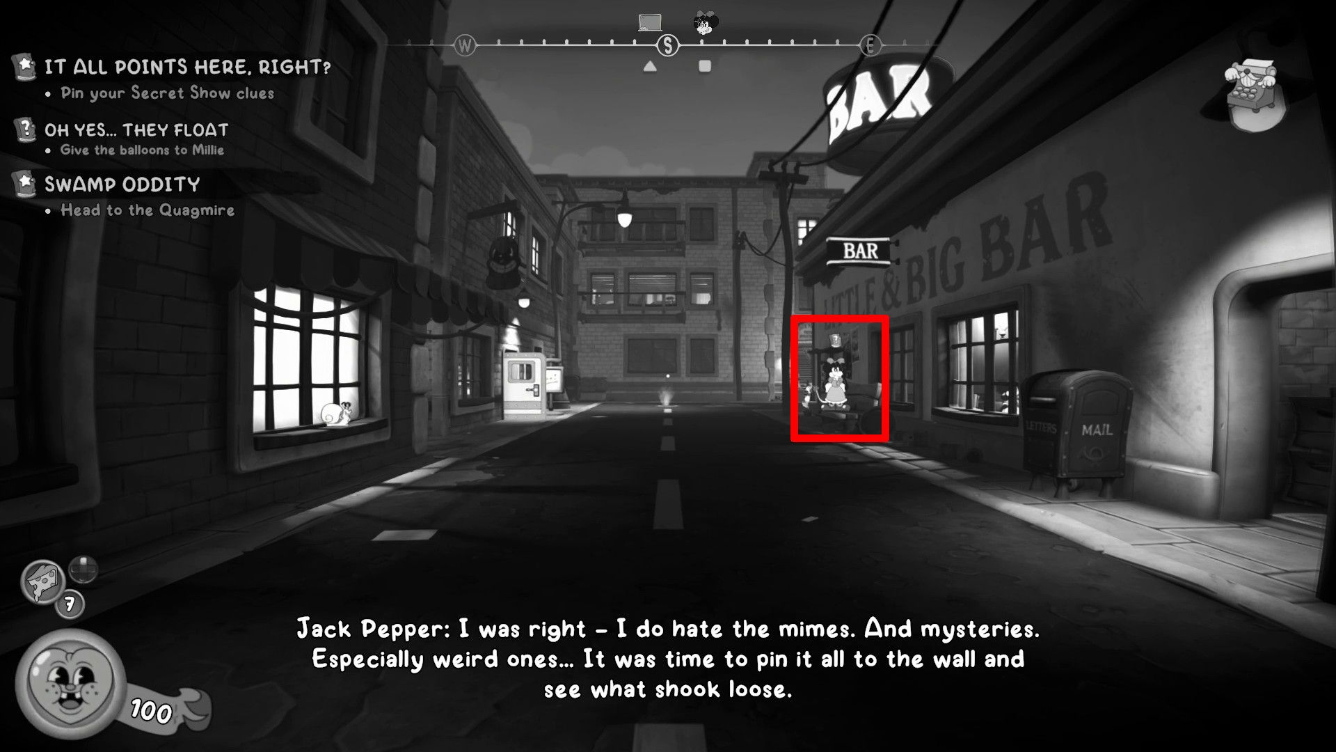 Once you’ve completed the “It All Points Here, Right?” quest from the Secret Show, go to the front of the Little & Big bar. It’s located outside, across from the Soup to Nuts shop in the P.I. Office. Talk to Millie Curd, a mouse you’ll find sitting on a bench there.