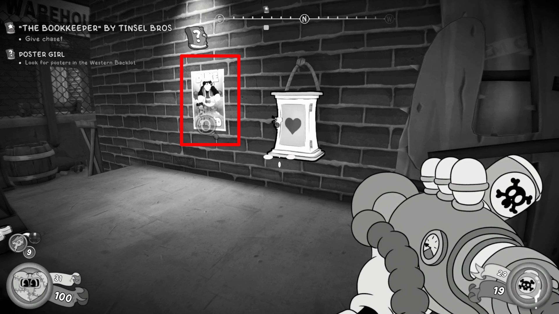 2. Take the stairs just past the NPC and look on the brick wall to find the “Triumph of Willie” movie poster.