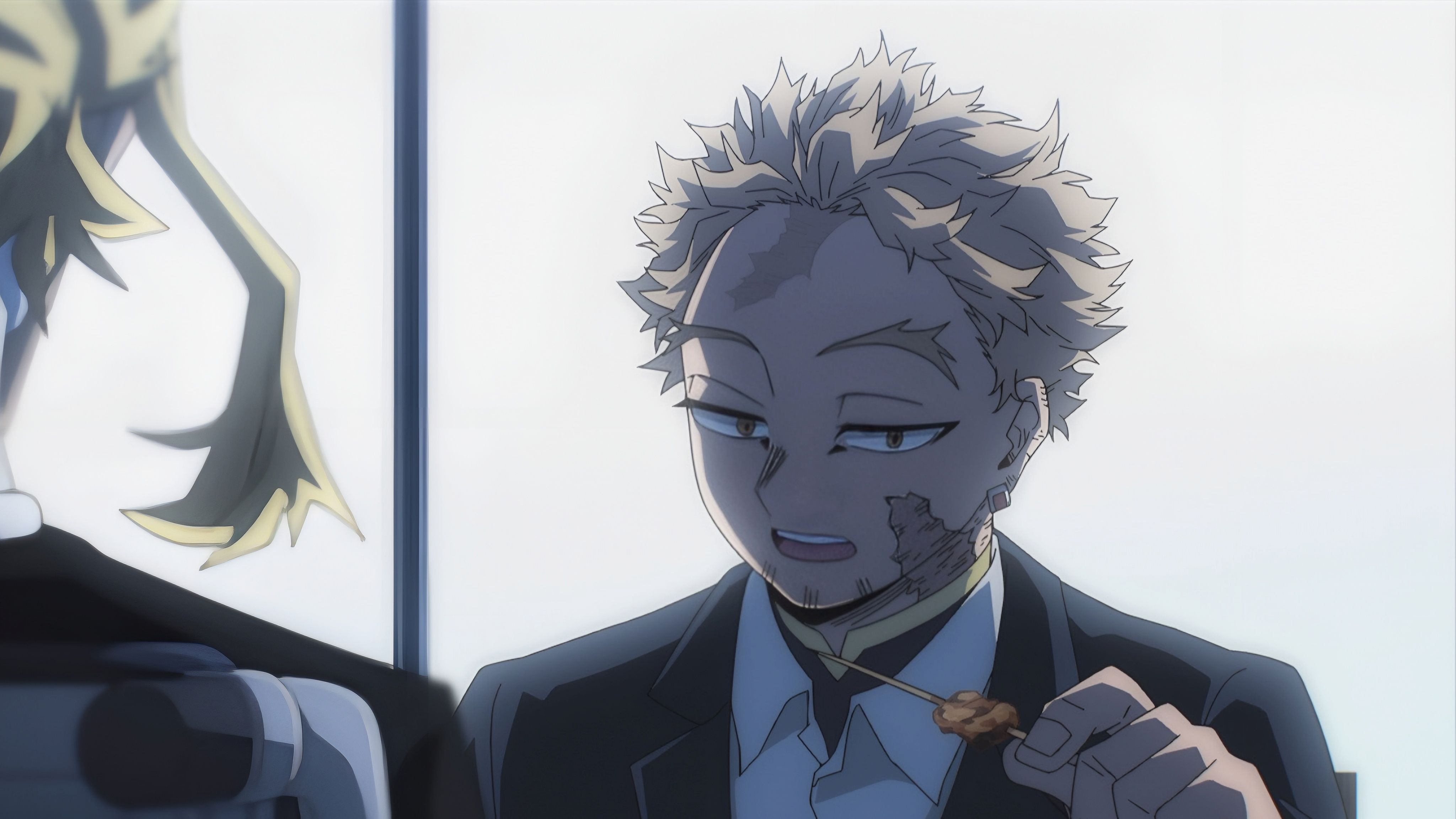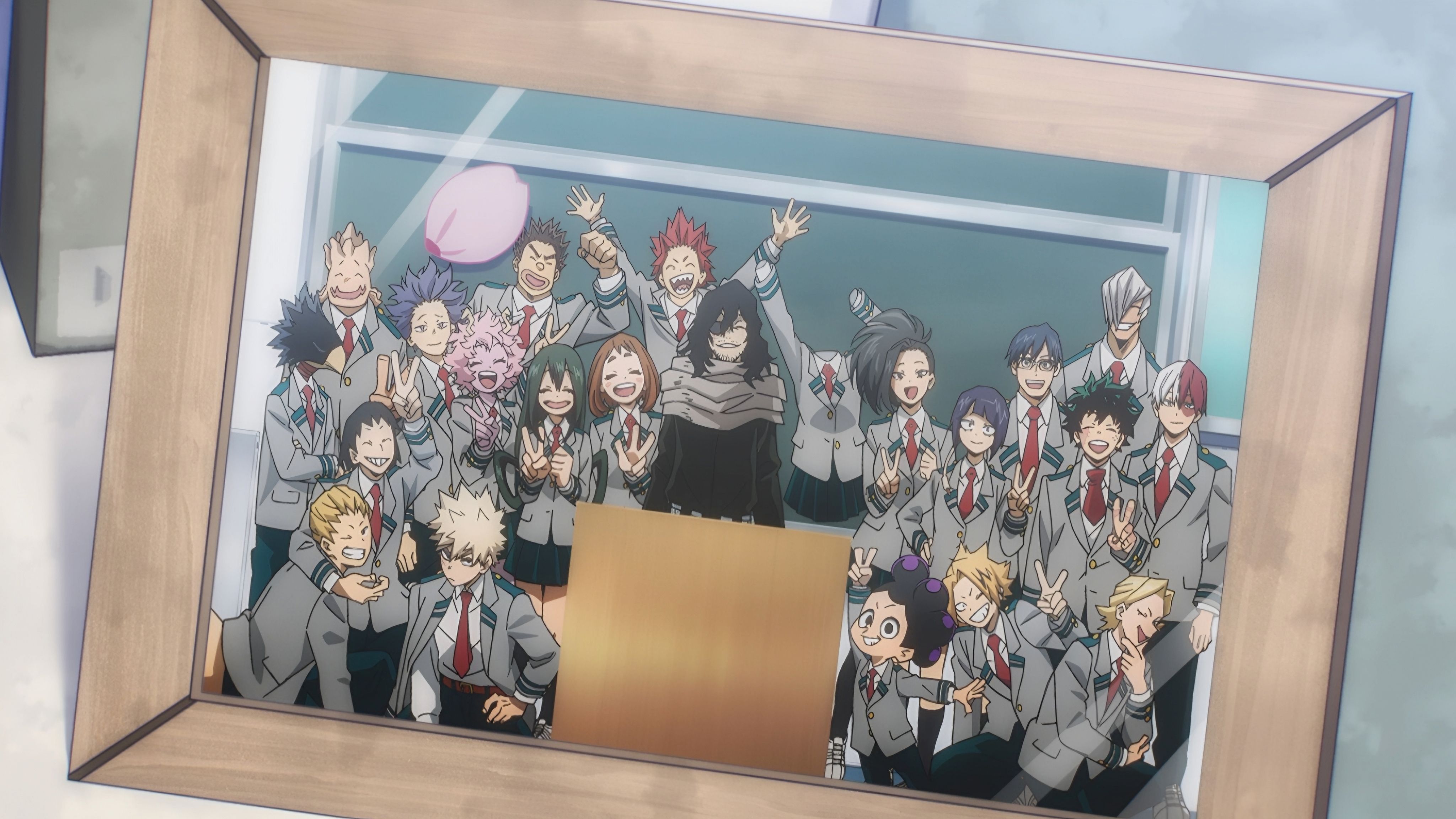 The first picture shows Midoriya smiling. It’s followed by a photo of Class 1-A with their teacher, Shota Aizawa. The next image features the pro-hero Hawks happily eating a skewer.