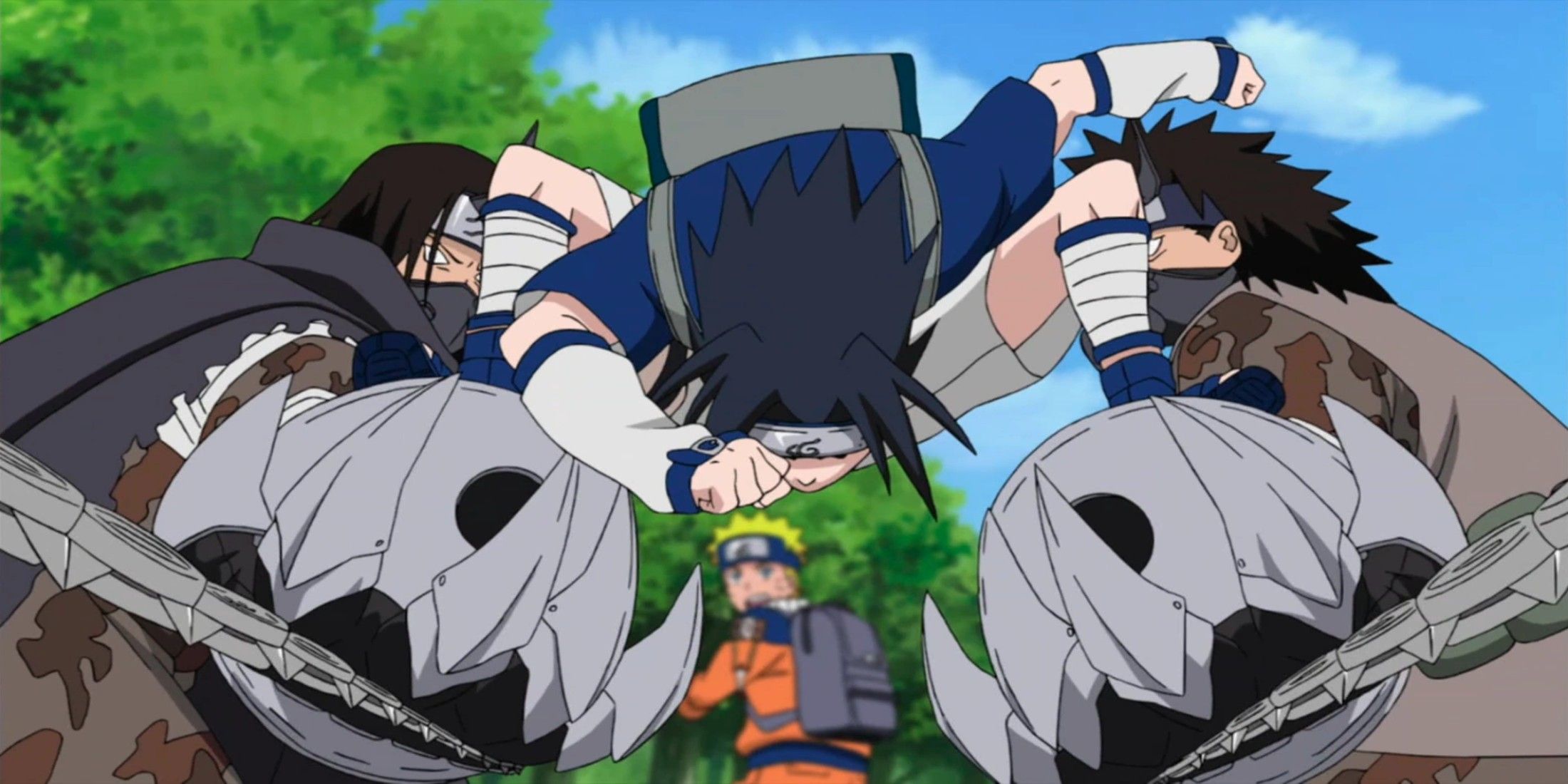 Their assignment was to escort an architect safely to the Land of Waves. Though it seemed like an easy job, the Demon Brothers immediately threatened their mission with a surprise attack on Kakashi, briefly knocking him down. This gave them a chance to attack Naruto, who was caught off guard. Luckily, Sasuke reacted quickly and saved him. Sasuke could have continued the fight, but Kakashi swiftly defeated the assassins.