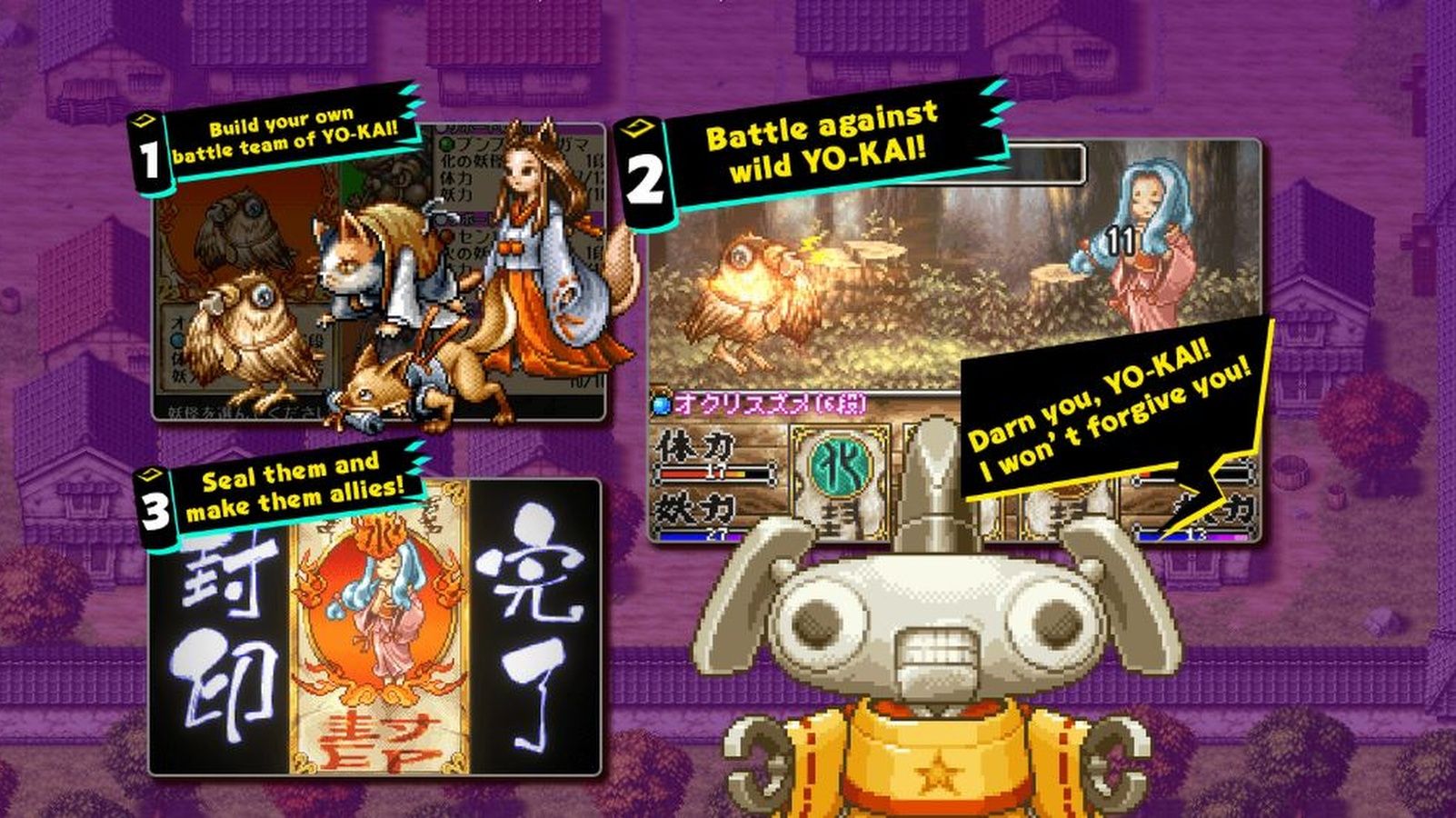 Similar to the original Pokémon games, Yo-Kai Watch boasts around 150 different Yo-Kai to encounter and battle. However, not all of these creatures are friendly, and you won’t be able to add every one to your team. Players will follow the story of Navinosuke, a uniquely charming robotic onmyoji—a traditional Japanese spirit worker. Created by The Institute to combat dangerous spirits, Navinosuke has the power to seal Yo-Kai, and this ability is key to building a strong team.