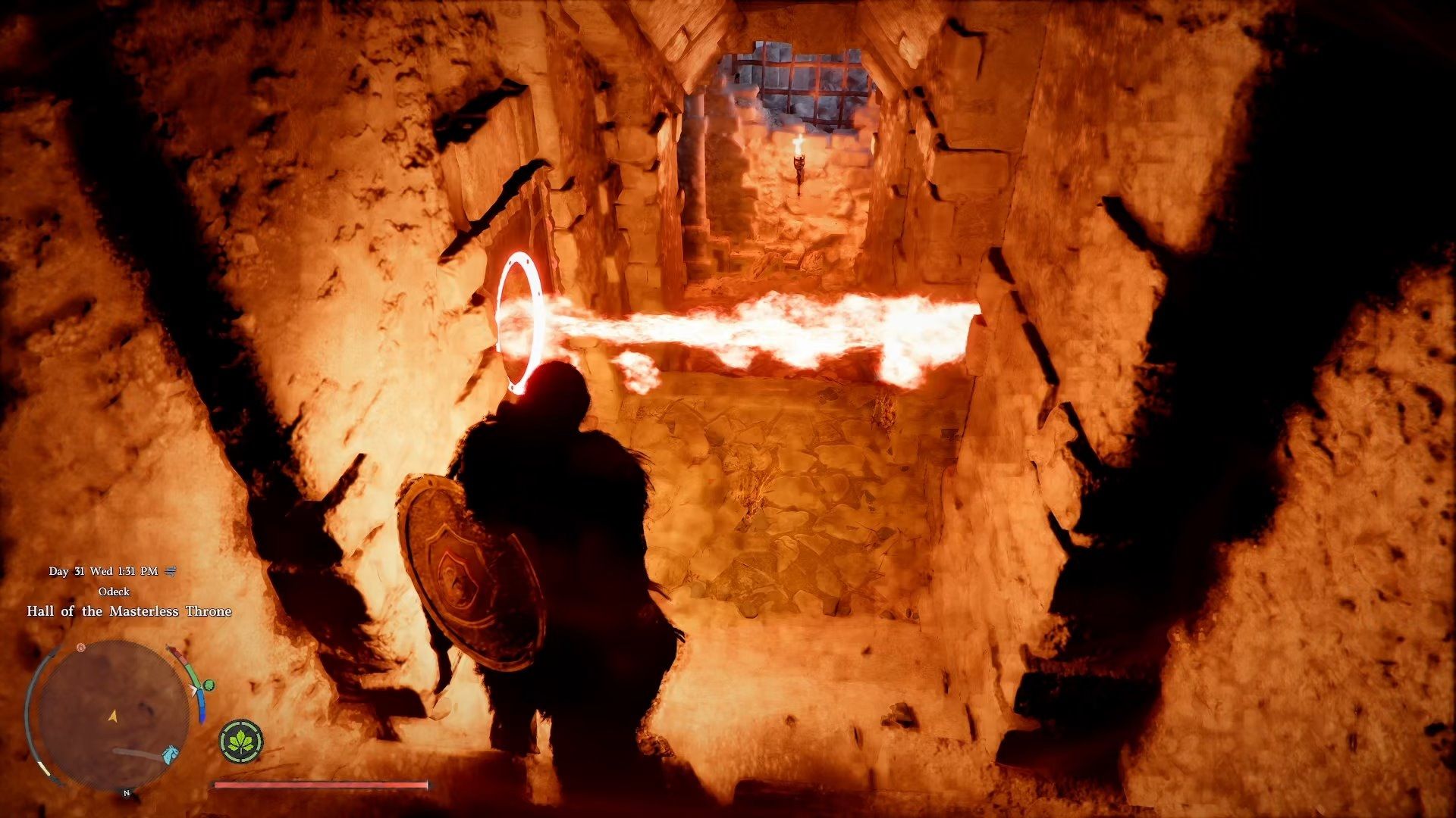 You can find the Oath Ring Shield in the Hall of the Masterless Throne, an underground area. To get there, look for a trapdoor in the Volvior Ruins, which are located in the Odeck region. Odeck is in the top left corner of the map, north of the Steel Mountains. Here’s how to obtain the shield:
