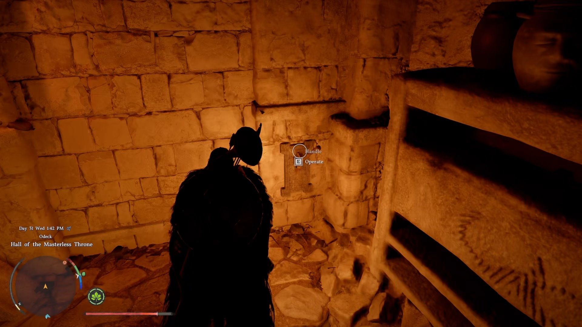 Interact with the Handle on the wall to operate it, revealing a hidden chamber behind the stone wall.