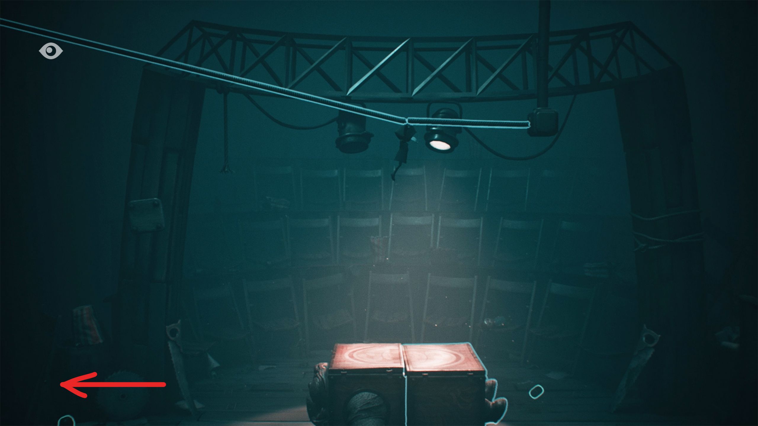 Soon after figuring out the radio puzzle in *Little Nightmares 3*, the characters slide down a zip line into a tent and discover a deceased person inside two boxes, appearing to have been cut in half.
