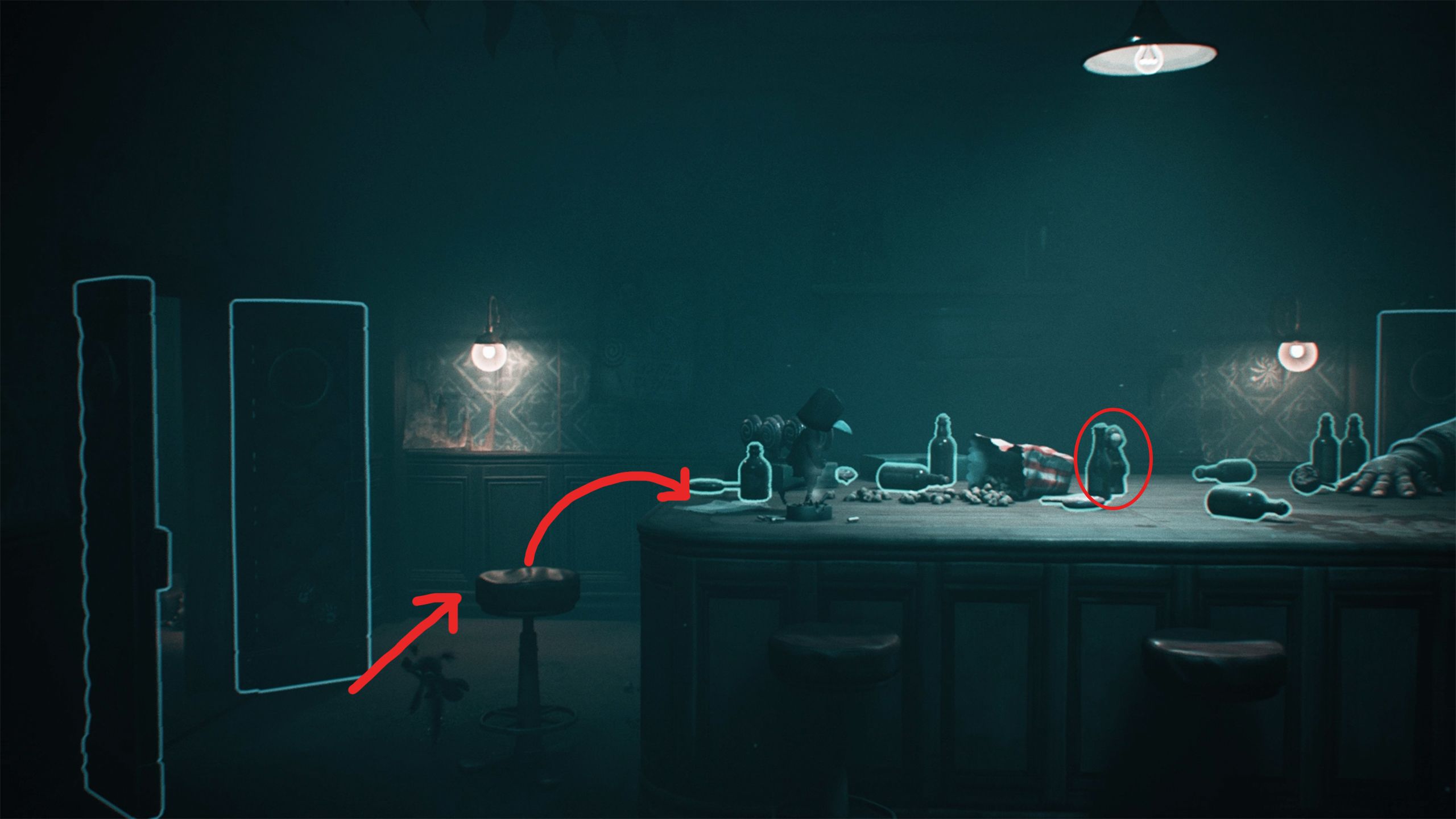 After you and your partner use the chandelier to get to the upper floor in LN3, go through the door together. Then, jump onto the barstool to reach the bar itself, and you’ll find the Lady Statue hidden among the empty bottles.
