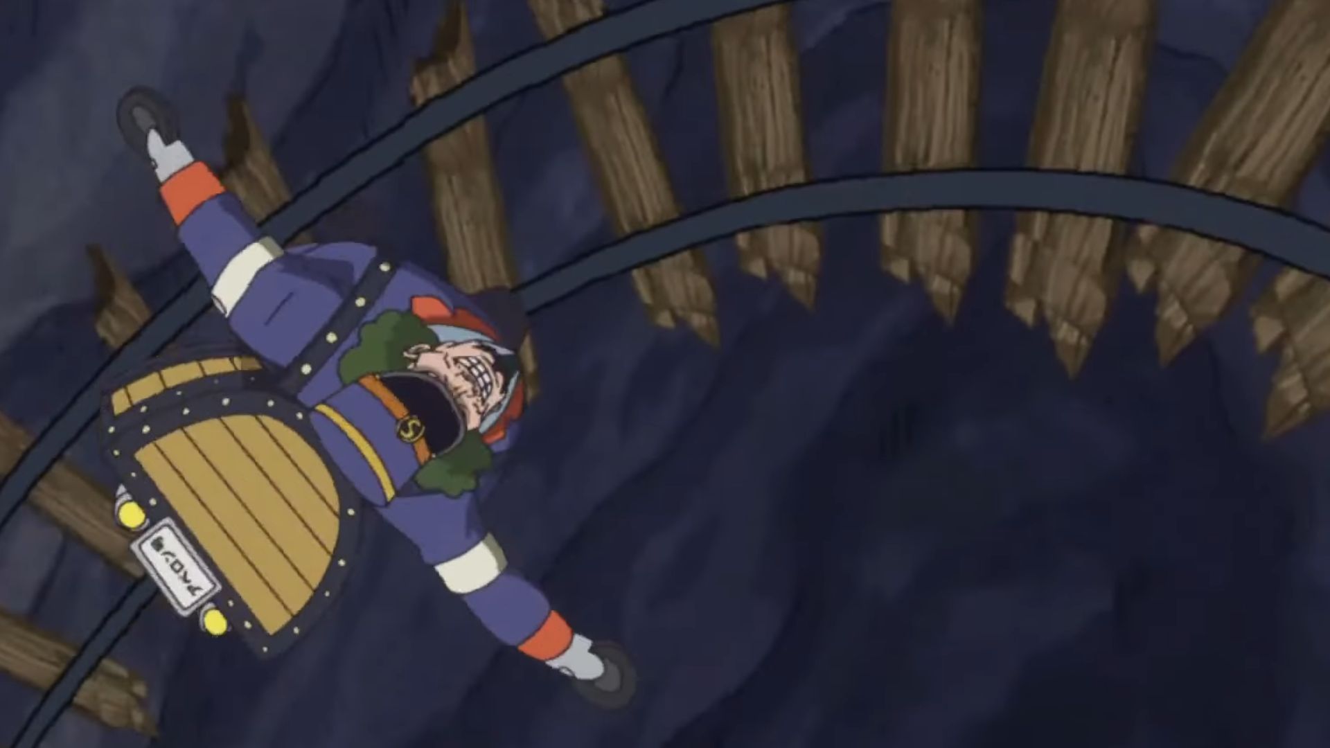 Continuing with the Silver Pirate Alliance’s mining focus, Bill’s crewmate, Aveyron, ate a peculiar Devil Fruit called the Koro Koro no Mi. This fruit gave him the ability to transform into a human rail cart, sprouting spinning wheels on his arms and legs.
