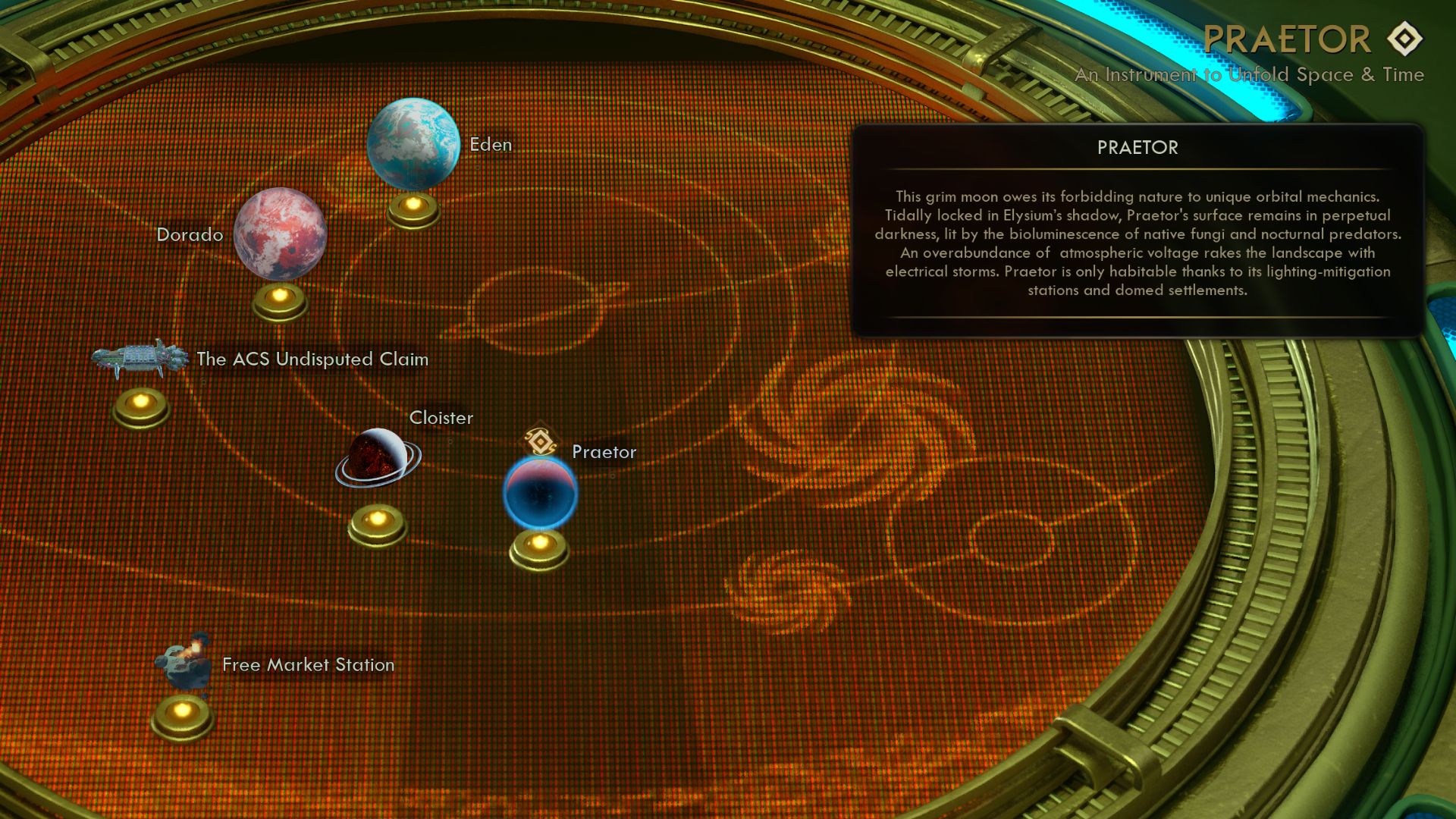 - The Orrery outside the Observatory reveals the answer to the third riddle of the Order Initiate puzzle – pay attention to the planets that orbit each other (Cloister and Praetor), and the rotation of Eden (the small green/blue moon).