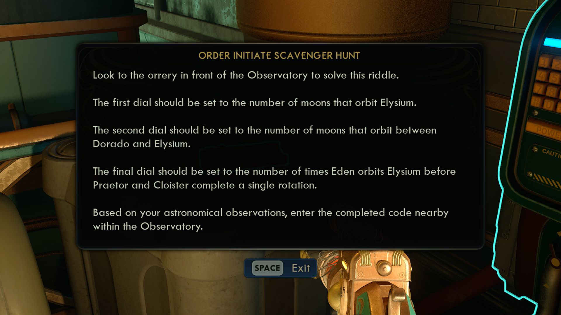 You can find clues to solve the Order Initiate Scavenger Puzzle in three places: near the Scavenger Hunt code input device in the museum gallery, at the Orrery outside the Observatory, and on the map of the Arcadia system while you’re on the Incognito.