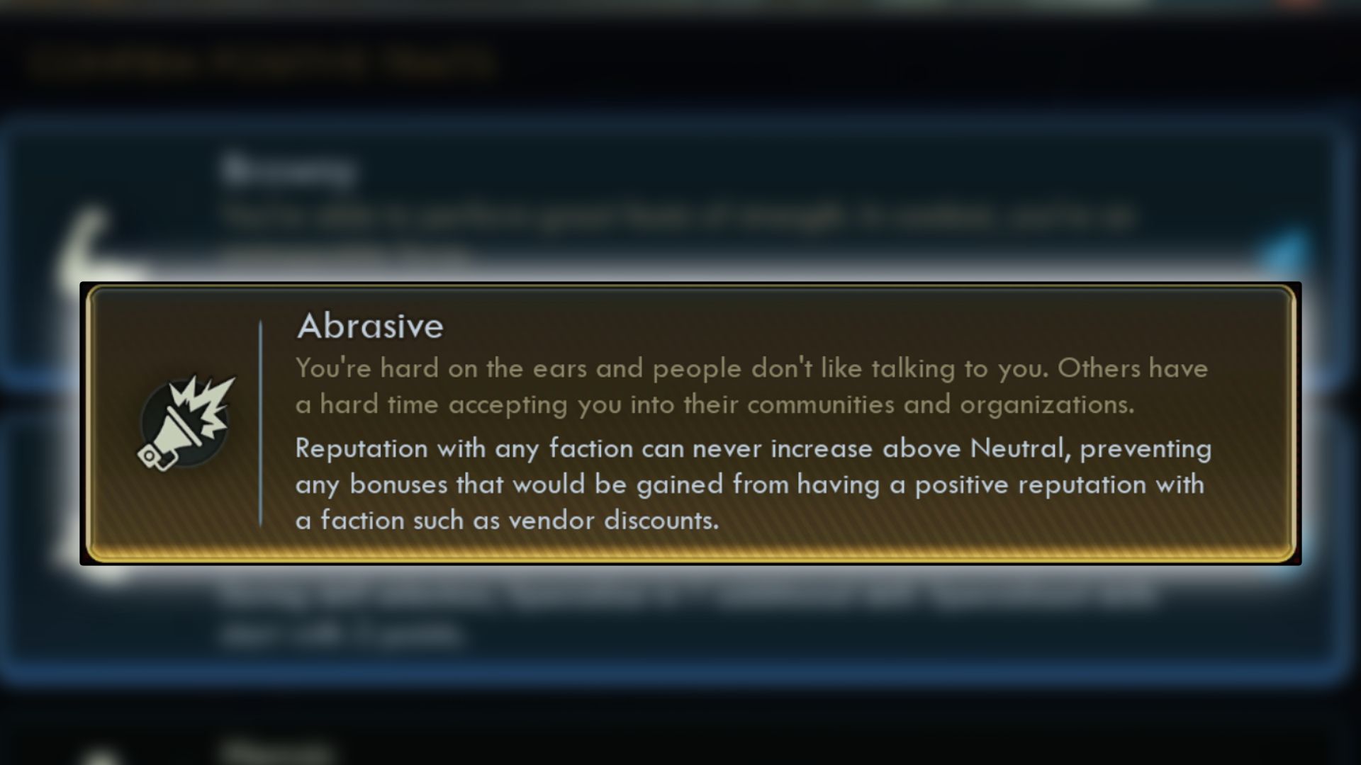 In Outer Worlds 2, the Abrasive trait is the most detrimental. It permanently limits your character’s reputation with any faction to Neutral – you can lose reputation, but you’ll never be able to gain any positive standing.
