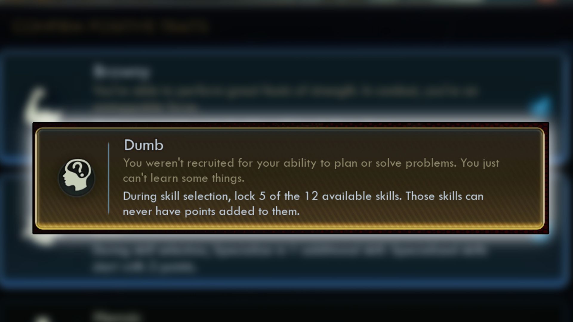 If you want to maintain good relationships with factions, the Sickly trait is a better choice, as it doesn’t limit your reputation gains. If you’re skilled at building strong characters, the Dumb trait is also an option.