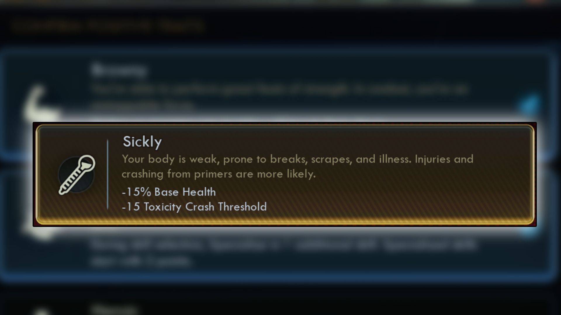 Okay, so I was worried about having lower health because of the Sickly trait, but honestly, it’s not a huge deal if you focus on boosting your armor and grabbing perks that help you stay alive. I found that just leveling up my Medicine skill a bit really covered any weakness from being sickly. It’s all about working around it!