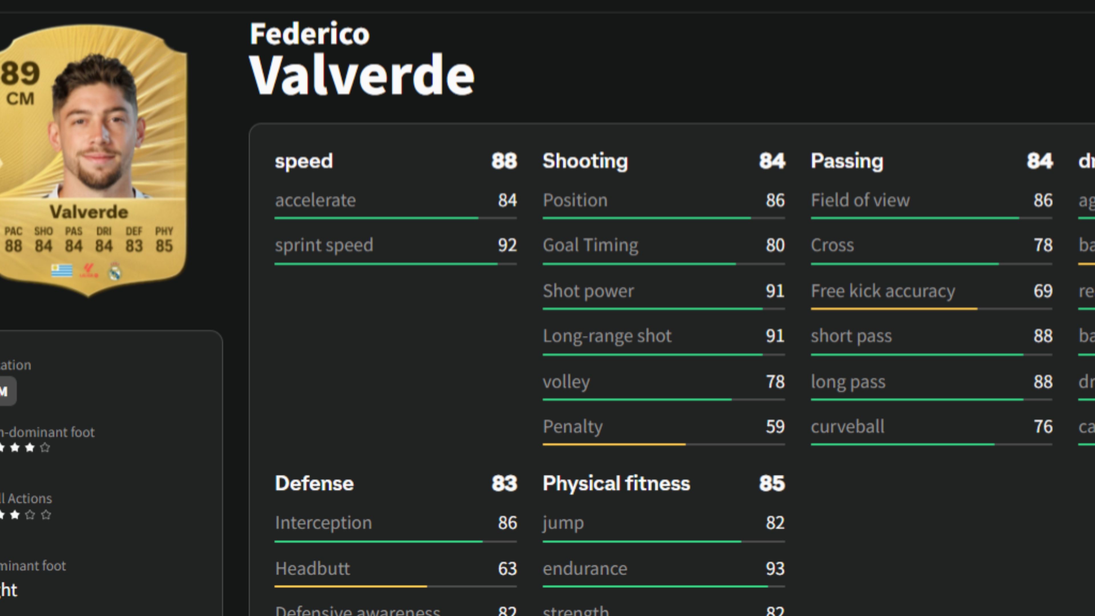 Federico Valverde appears to be a complete midfielder in EA Sports FC 26. He’s known for being dependable, quick, and physically strong, and his 89 overall rating accurately reflects that. He can cover a lot of ground, make powerful tackles, and still join the attack with speed. Statistically, Valverde excels with 85+ pace, excellent stamina, and accurate long-range shooting.