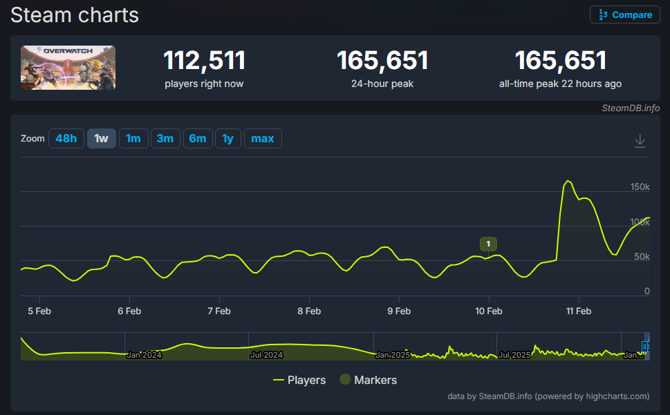 Just to add some perspective, Overwatch previously peaked at around 42,000 concurrent players back in January. Currently, the game consistently has over 112,000 players online – that’s even better than its original launch! You can see the live player numbers on SteamDB below if you’re interested.