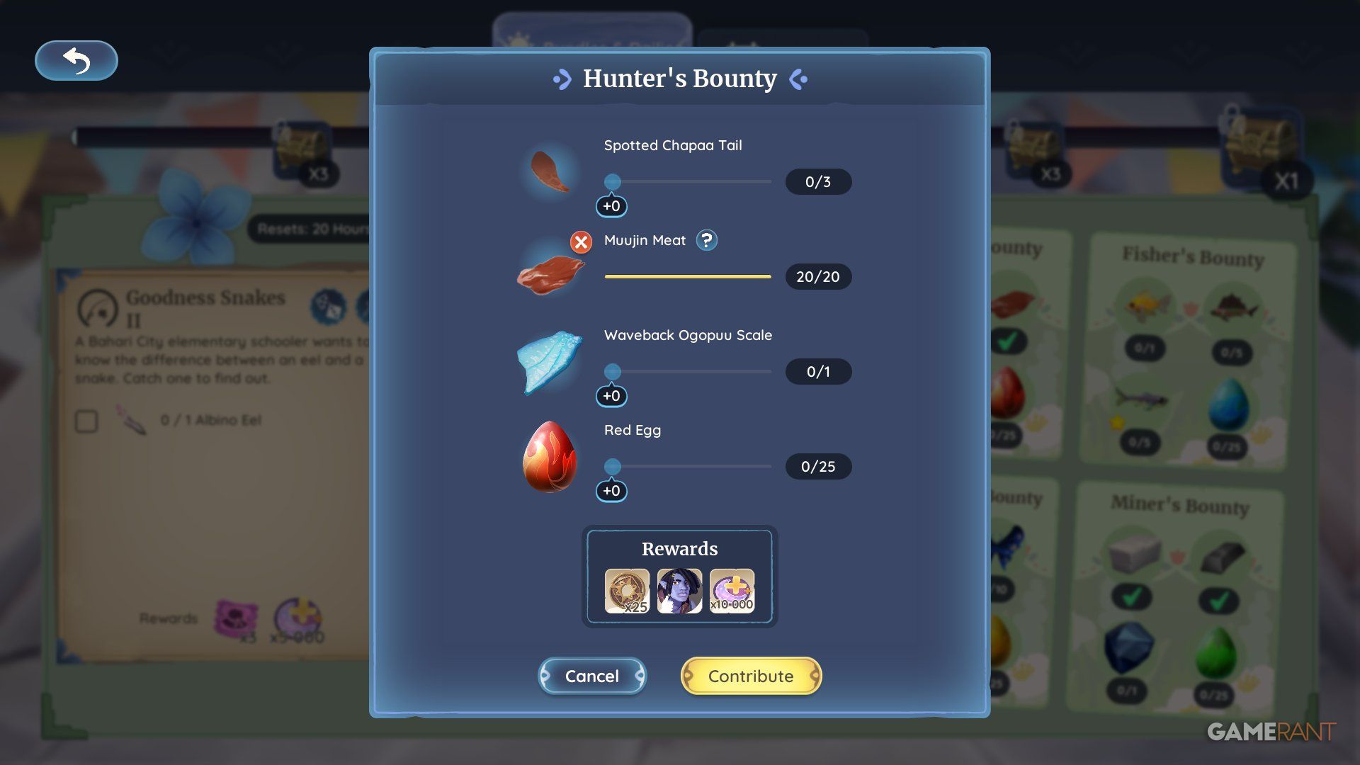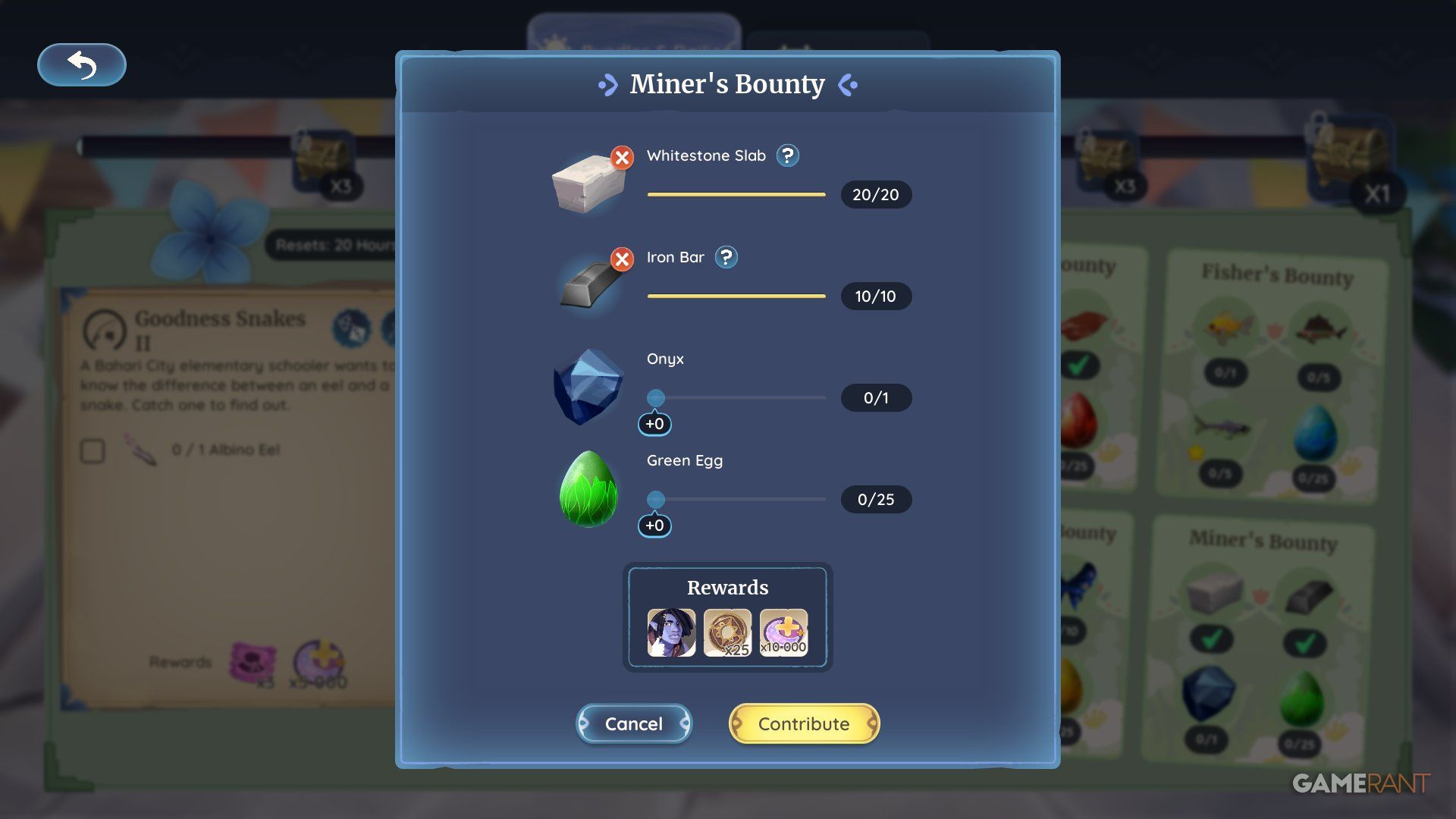 You can work on the Miner’s Bounty at the same time as the Hunter’s Bounty because the items needed are fairly easy to find. It will take a while to donate everything, as you’ll need to use the Smelter to create bars and slabs, but getting the resources themselves is quite simple.