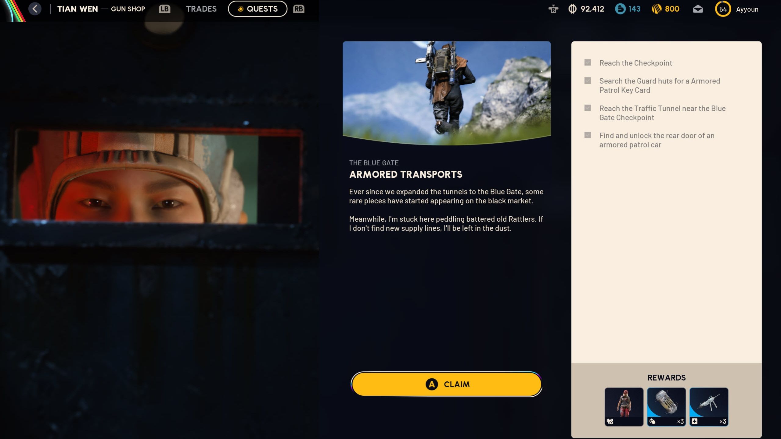 You can now leave the area and return to Speranza to claim your rewards: a Blue Yellow Aviator Outfit color, 3 Smoke Grenades, and 3 Defibrillators, for completing the quest.