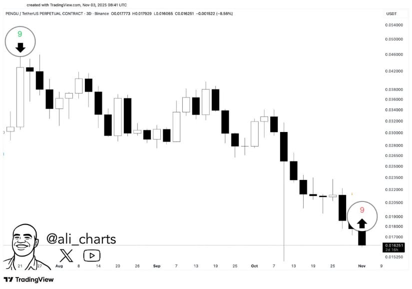 Ali Martinezβs latest update highlights that the TD Sequential indicator has flashed a buy signal for PENGU. This is the second β9β signal printed in recent months, with the previous one preceding a strong local rally. π€―π