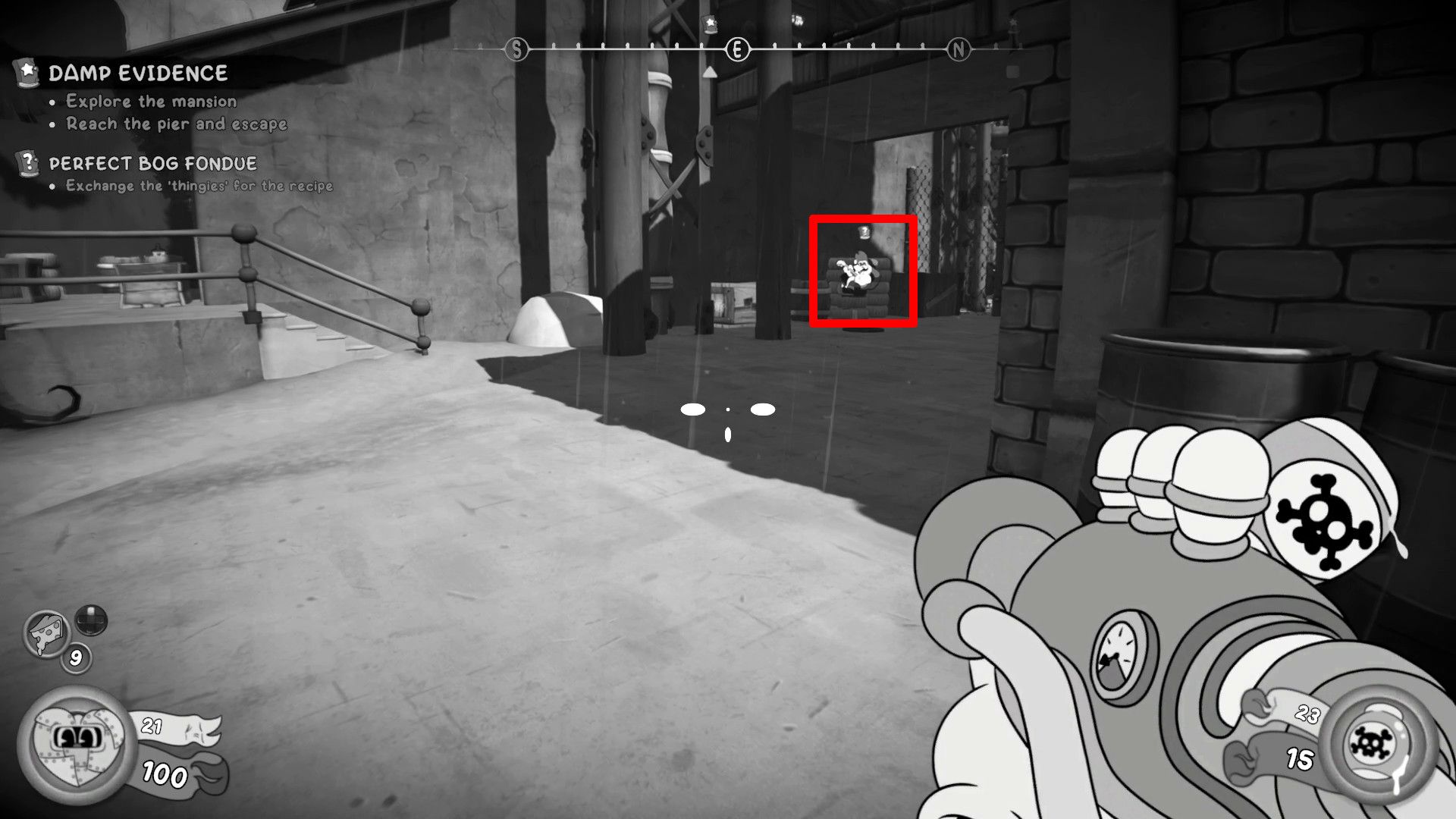 Inside the mansion, simply follow the main path to the dining room and look for the wall that seems perfectly ordinary. You’ll find the second item on a pile of cheese wheels located on the north side of the room.