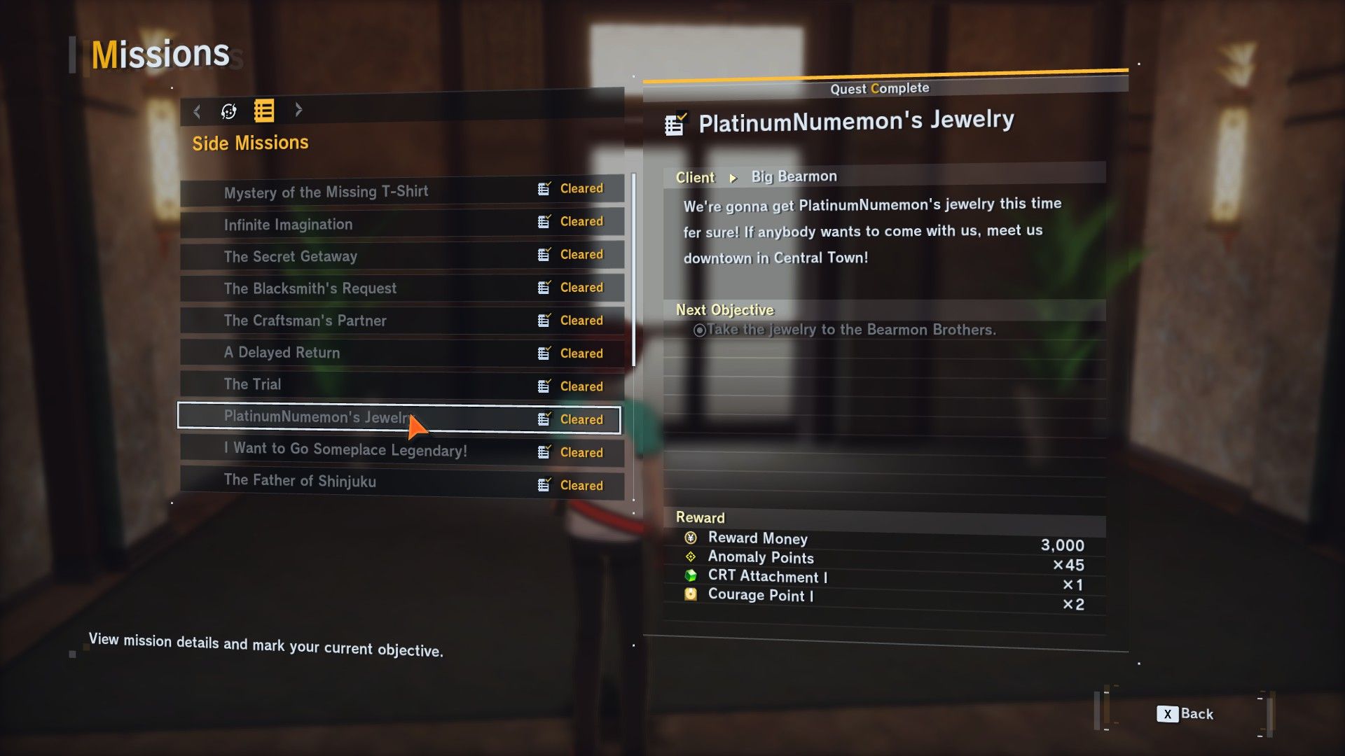 After defeating Vulcanusmon and finishing the Incoming Conflict Man Mission, players will get a message from the Bearmon Brothers. They’ll say they’re definitely going to get PlatinumNumemon’s Jewelry this time, but this is actually one of many times they’ve tried and failed. Take the Agent back to Central Town and go to the downtown area to find the Bearmon Brothers chatting with Solarmon, who is now part of their group.