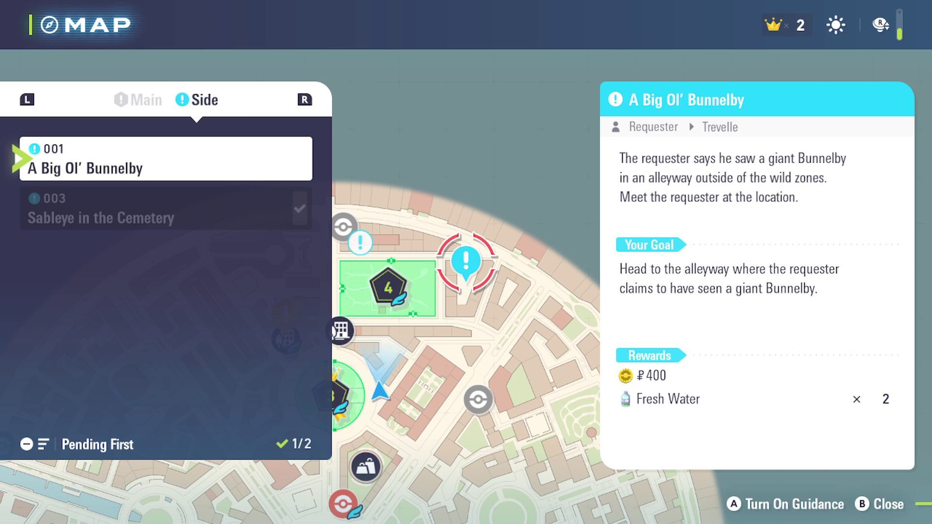When you start the quest, the game will suggest using guidance mode. If you skipped that initial prompt, you can still enable it later. Simply open the mission list by pressing X on the map, switch to the Side Missions tab by pressing R, and then turn on guidance for the “Big Ol’ Bunnelby” quest by pressing A.