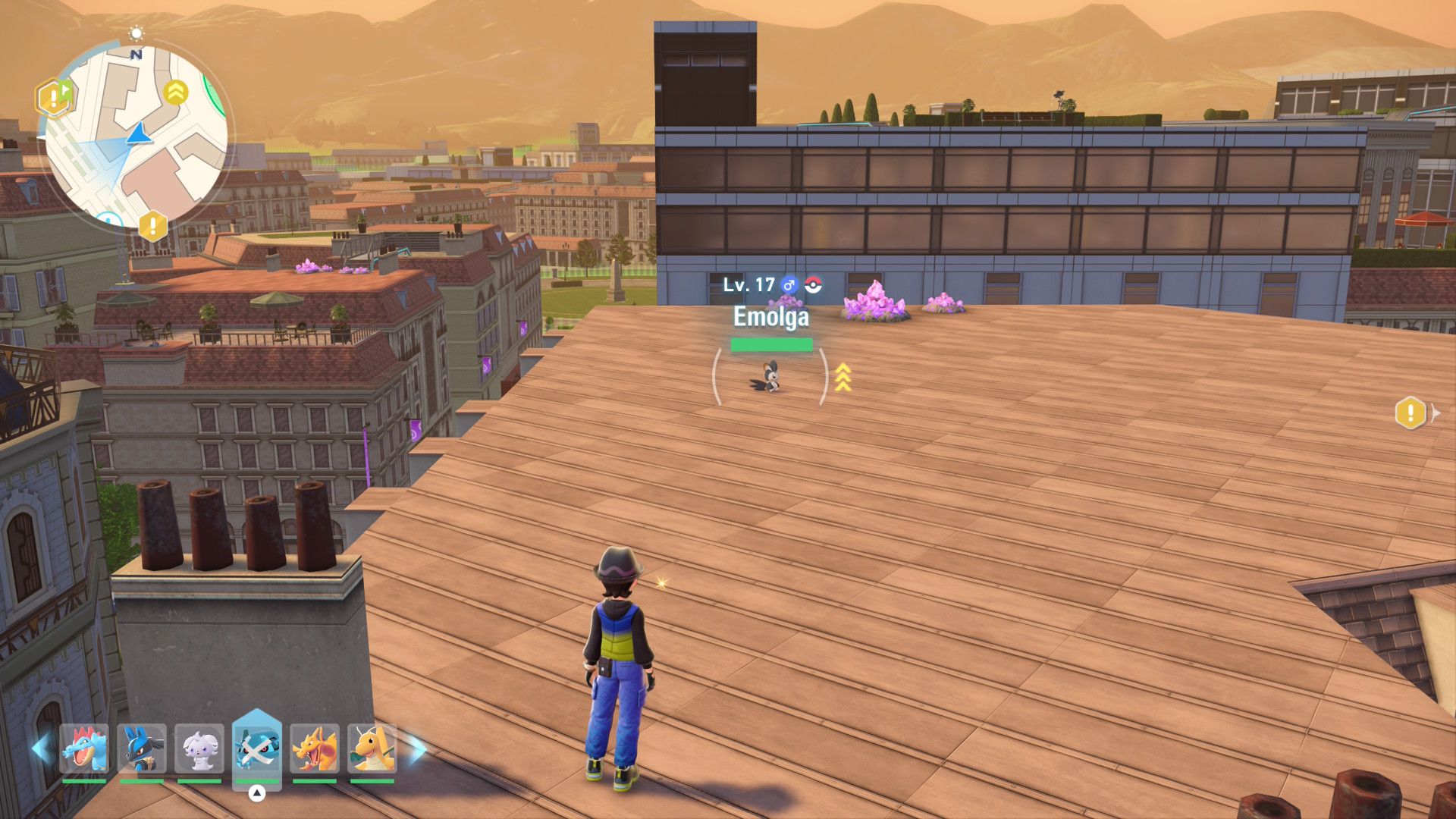 You can find Emolga wandering on the rooftops in Wild Zone 3. To increase your chances of finding its Shiny form, use the Holovator west of the Square Tower. Check especially around the rooftop near the street market alley to spot it.