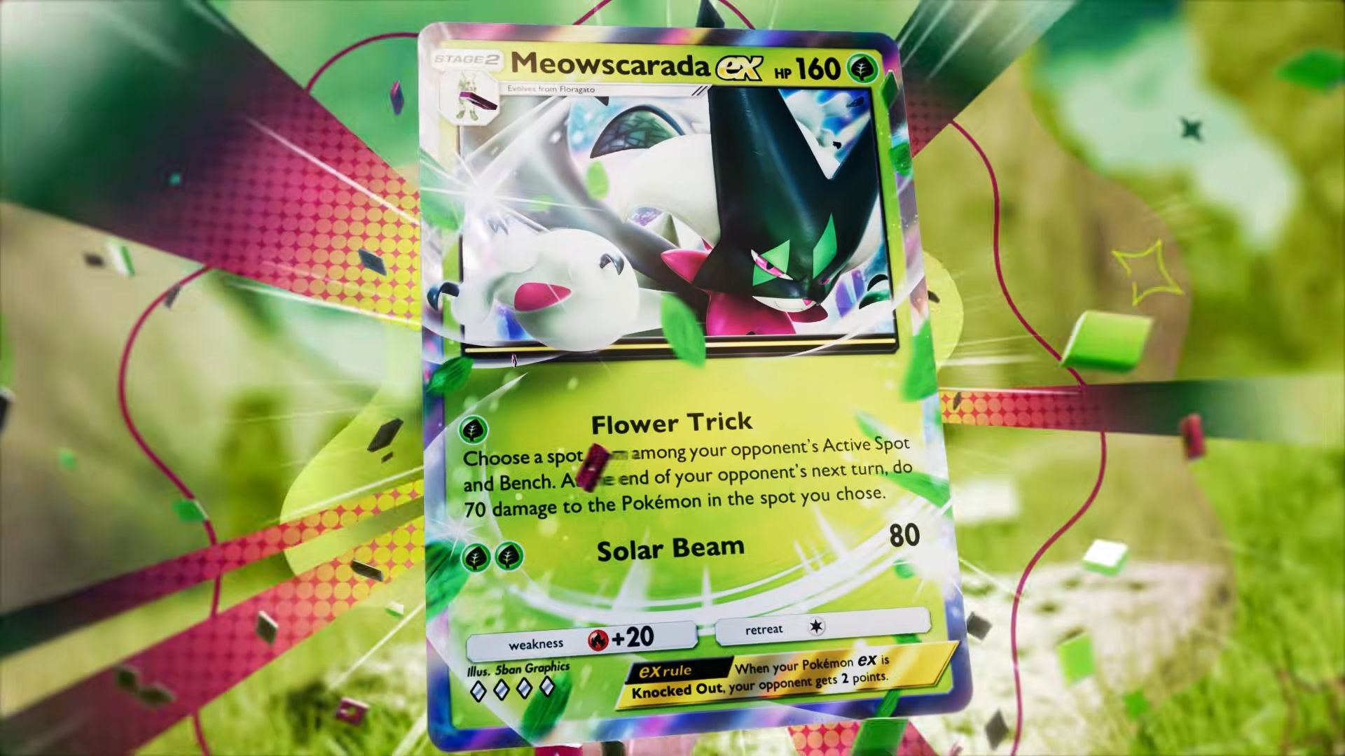 | Meowscarada EX | Flower Trick + Solar Beam | Choose a spot from among your opponent’s Active Spot and Bench. At the end of your opponent’s next turn, do 70 damage to the Pokemon in the spot you chose. |
