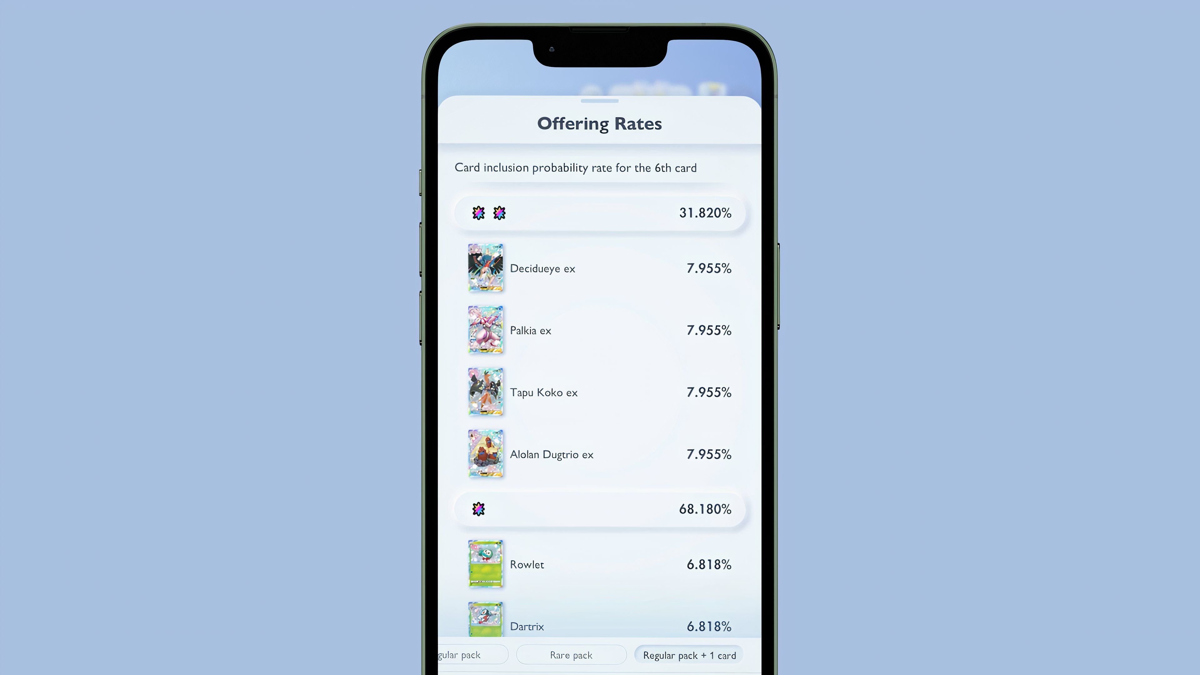 In the Pokemon TCG Pocket‘s Mega Rising expansion, the chance of getting a “shiny one” card from a six-card pack is now 6.818%, while “shiny two” cards have a 7.955% pull rate.