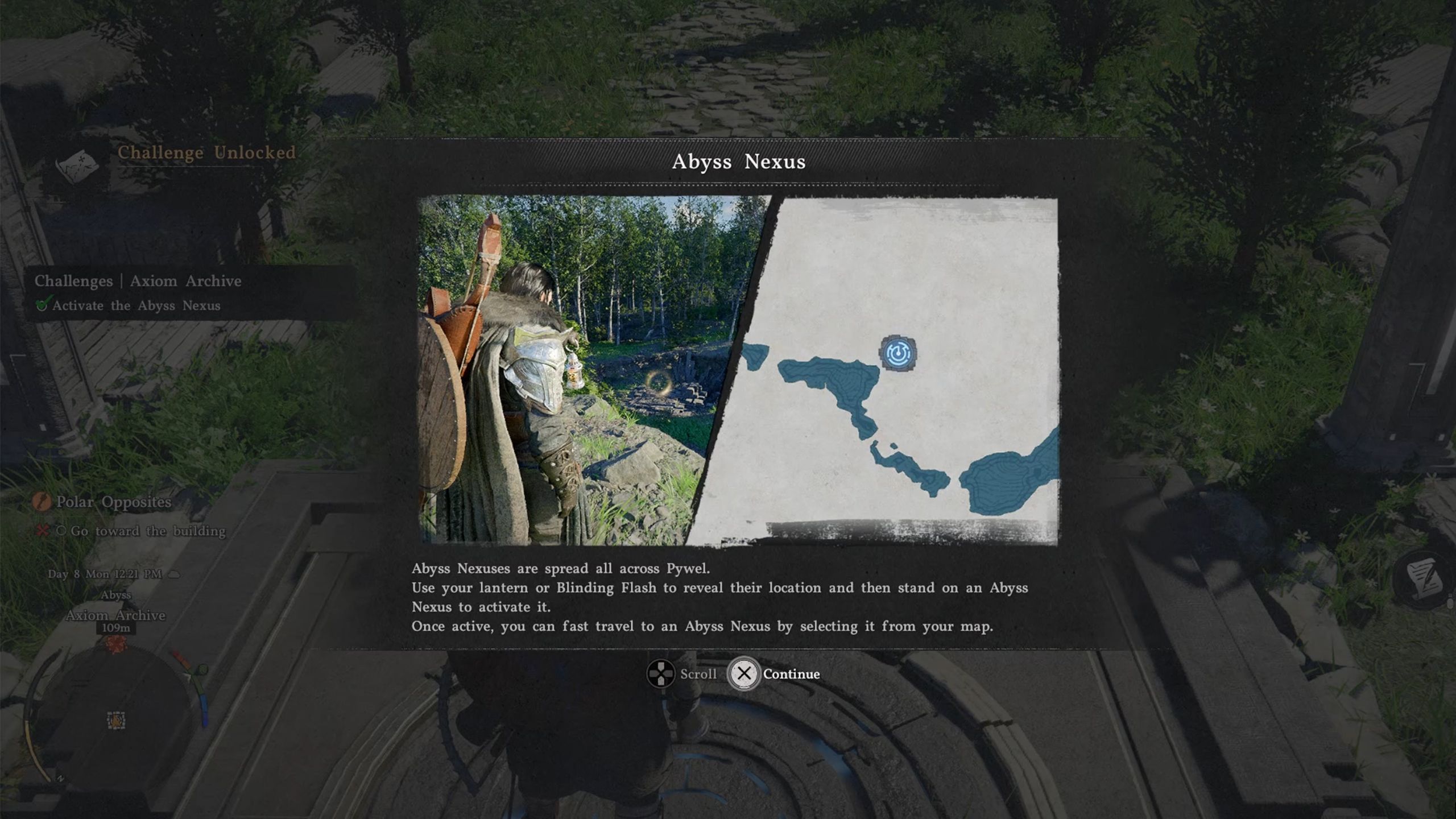 Once Kliff enters the portal in the office, he’s transported to the Axiom Archive. Walk up to the circular device and wait for the blue lights to activate. This is an Abyss Nexus, likely the first one you’ll find as you explore. A message will then appear, explaining what Abyss Nexuses are.