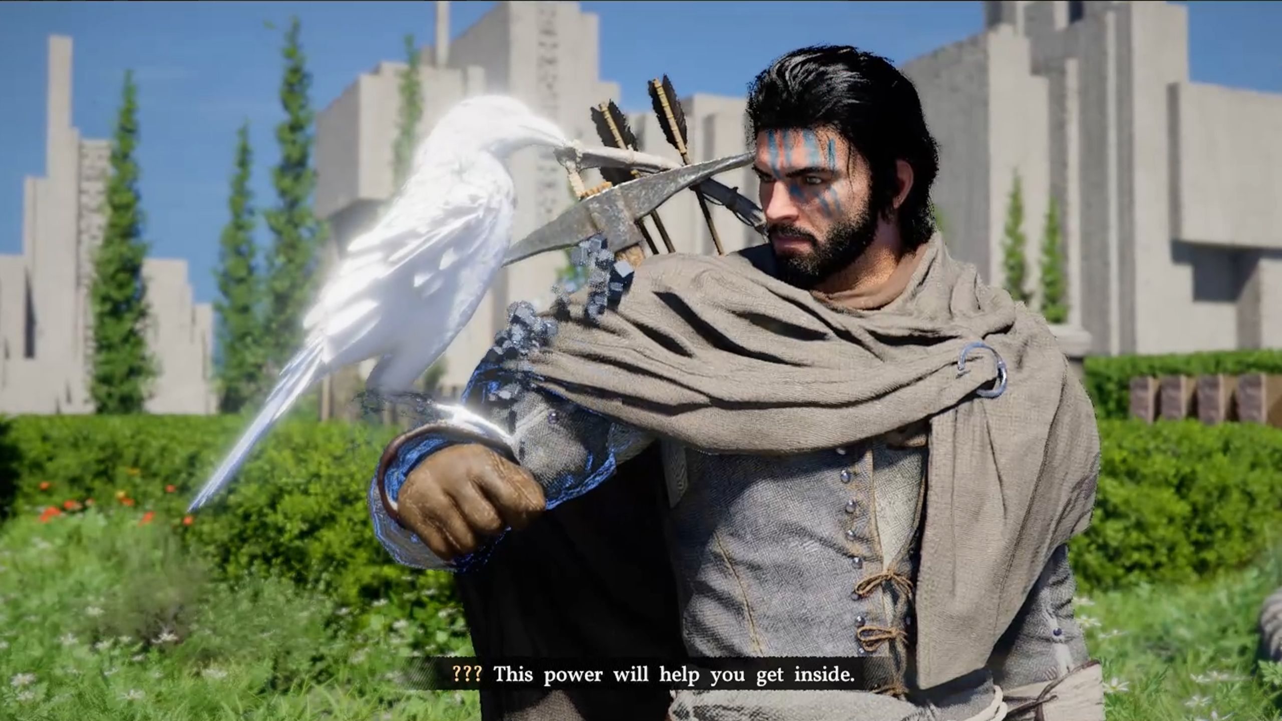 Continue walking towards the building until a cutscene begins. During the cutscene, a white crow will approach Kliff, land on his arm, and grant him a new ability before flying off. You’ll eventually learn this crow is the White Crow Witch from Crimson Desert, and she was the one who gave Kliff the Axiom Force ability.