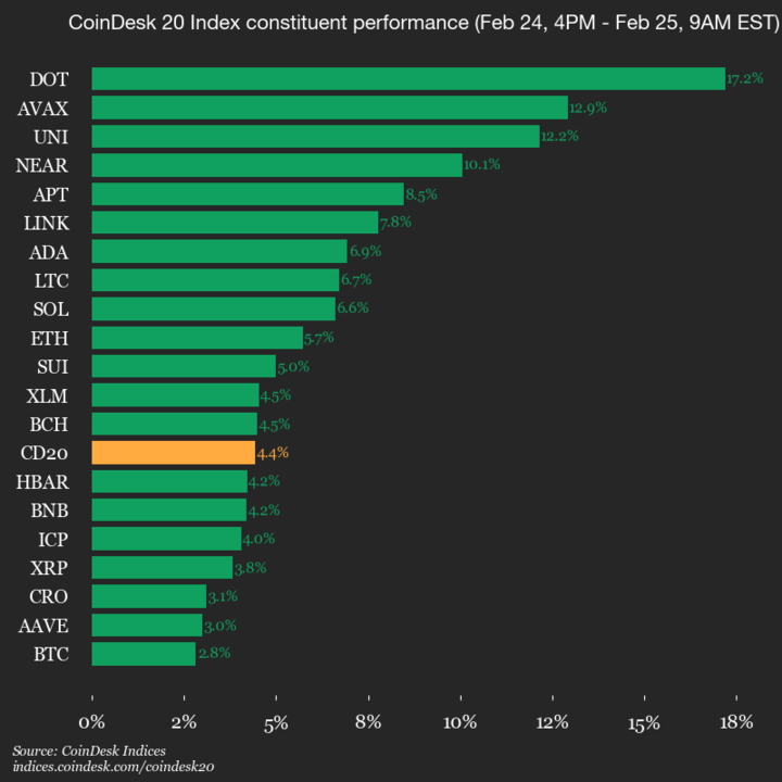 It seems the market has decided to surprise us all, for the CoinDesk 20 has seen a rather remarkable uptick, with all assets soaring like a flock of well-behaved swans on a calm pond. And who should take the lead in this delightful procession? None other than Polkadot (DOT), which has experienced a most impressive rise of 17.2%. But, of course, not all are as fortunate, as Bitcoin (BTC) finds itself trailing behind, barely managing a 2.8% increase.